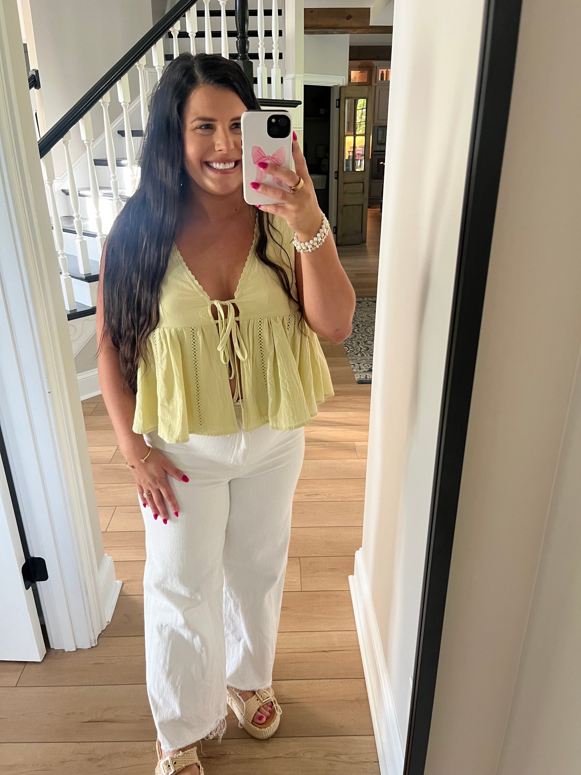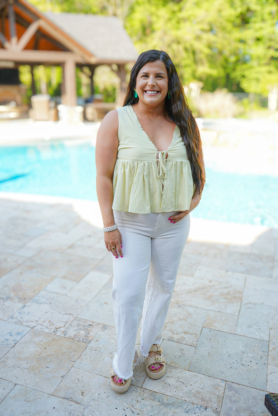 Enhance your wardrobe with the Aloe Allure Tie Top! This sleeveless peplum top features a tie front design in a beautifully vibrant aloe color. Look and feel your best with this top that flatters any figure. Perfect for any occasion, the color is true to the mirror picture.