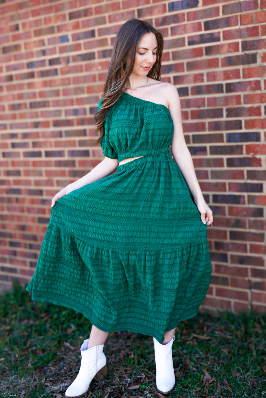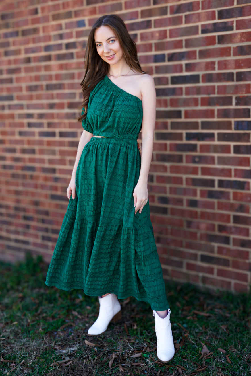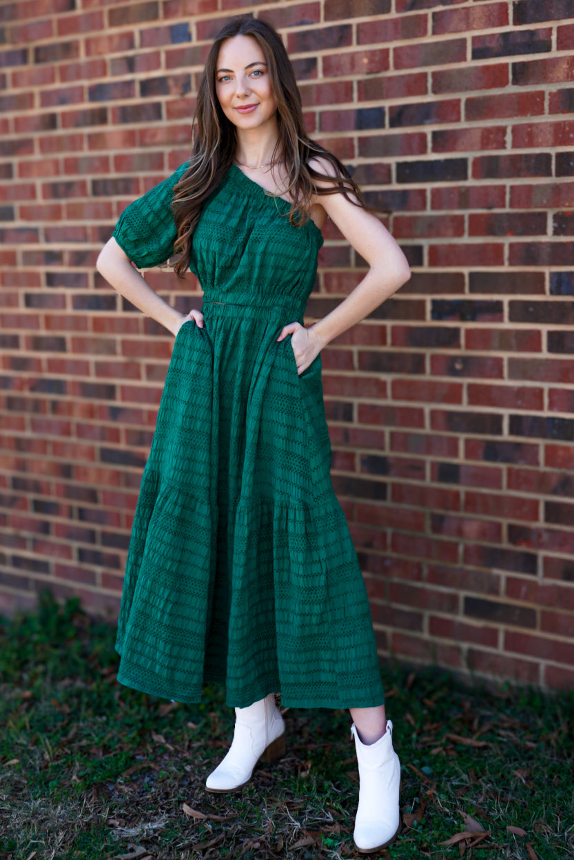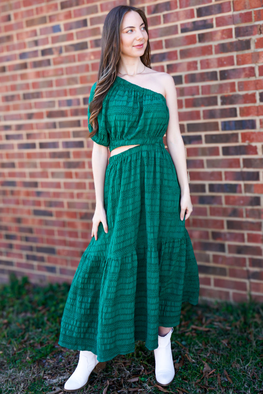 Make a statement in this playful hunter green maxi dress! The one shoulder design, puff sleeve, and side cut out add a unique touch to this tiered, textured woven dress. Perfect for any occasion, this dress will have you standing out in style!