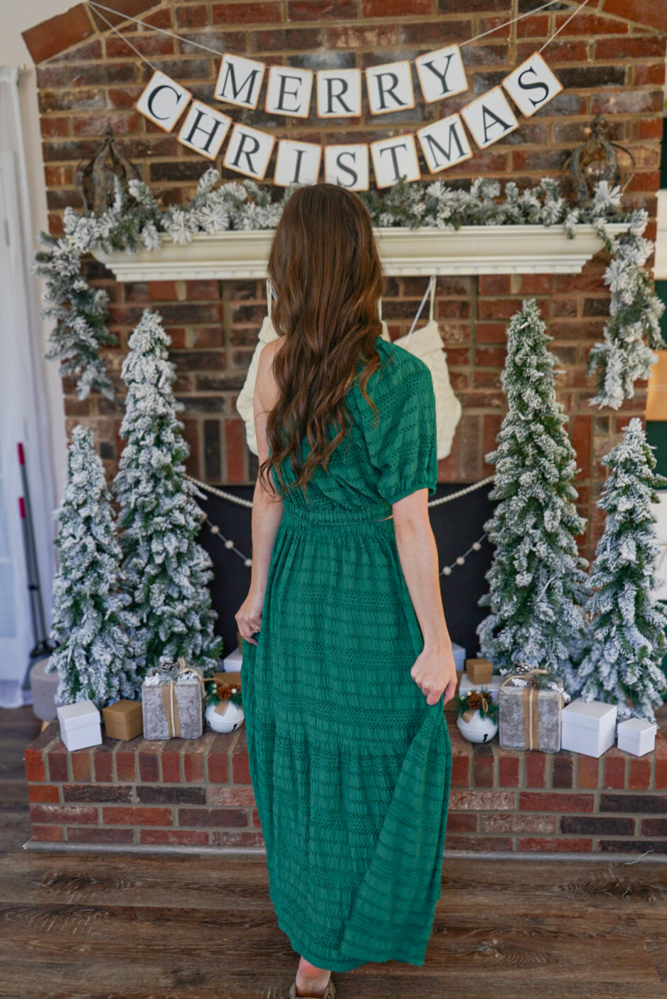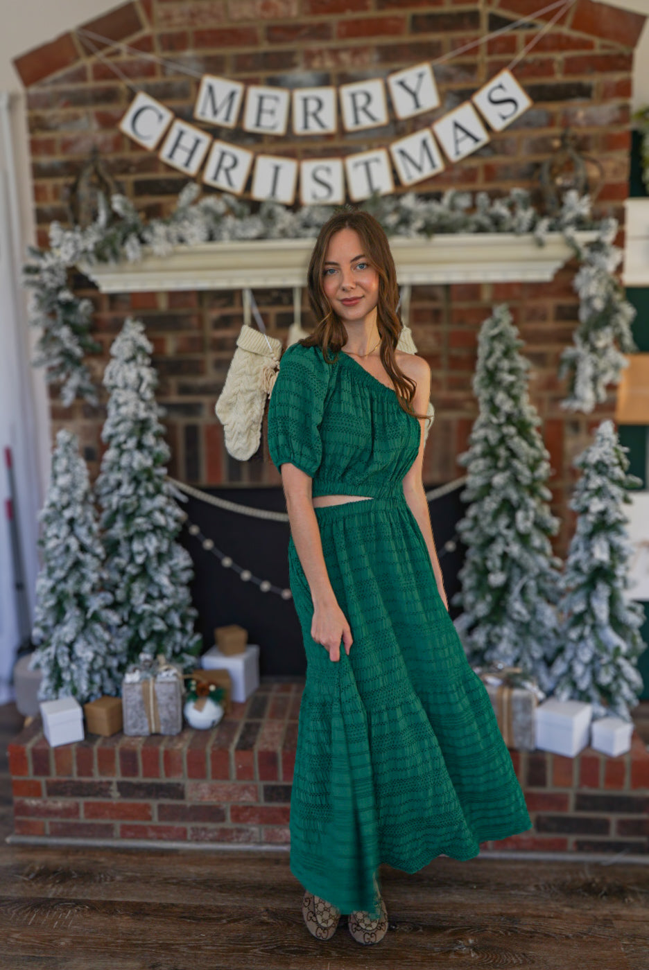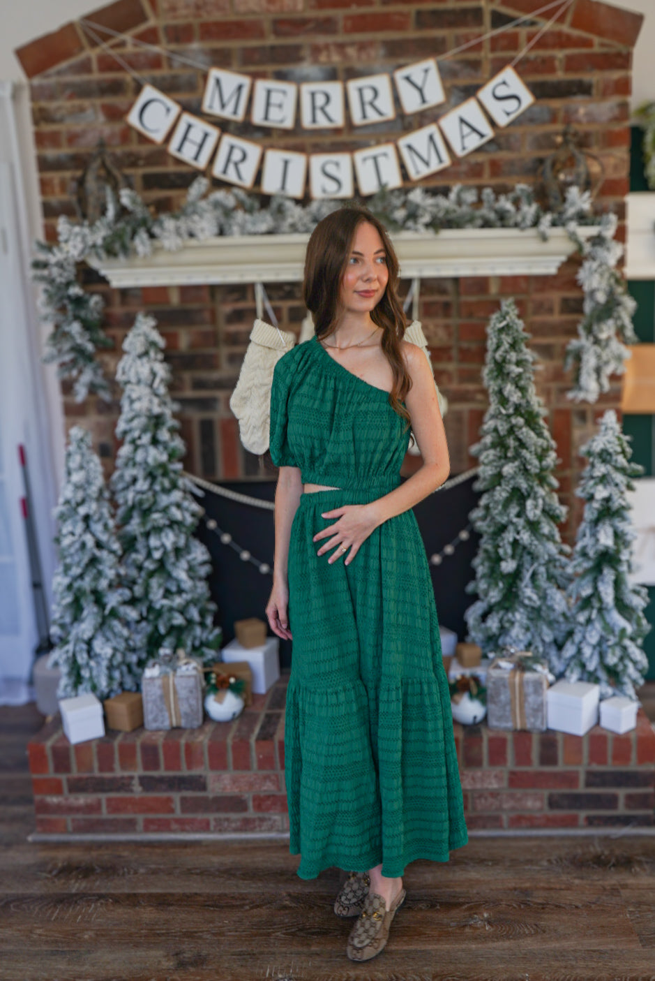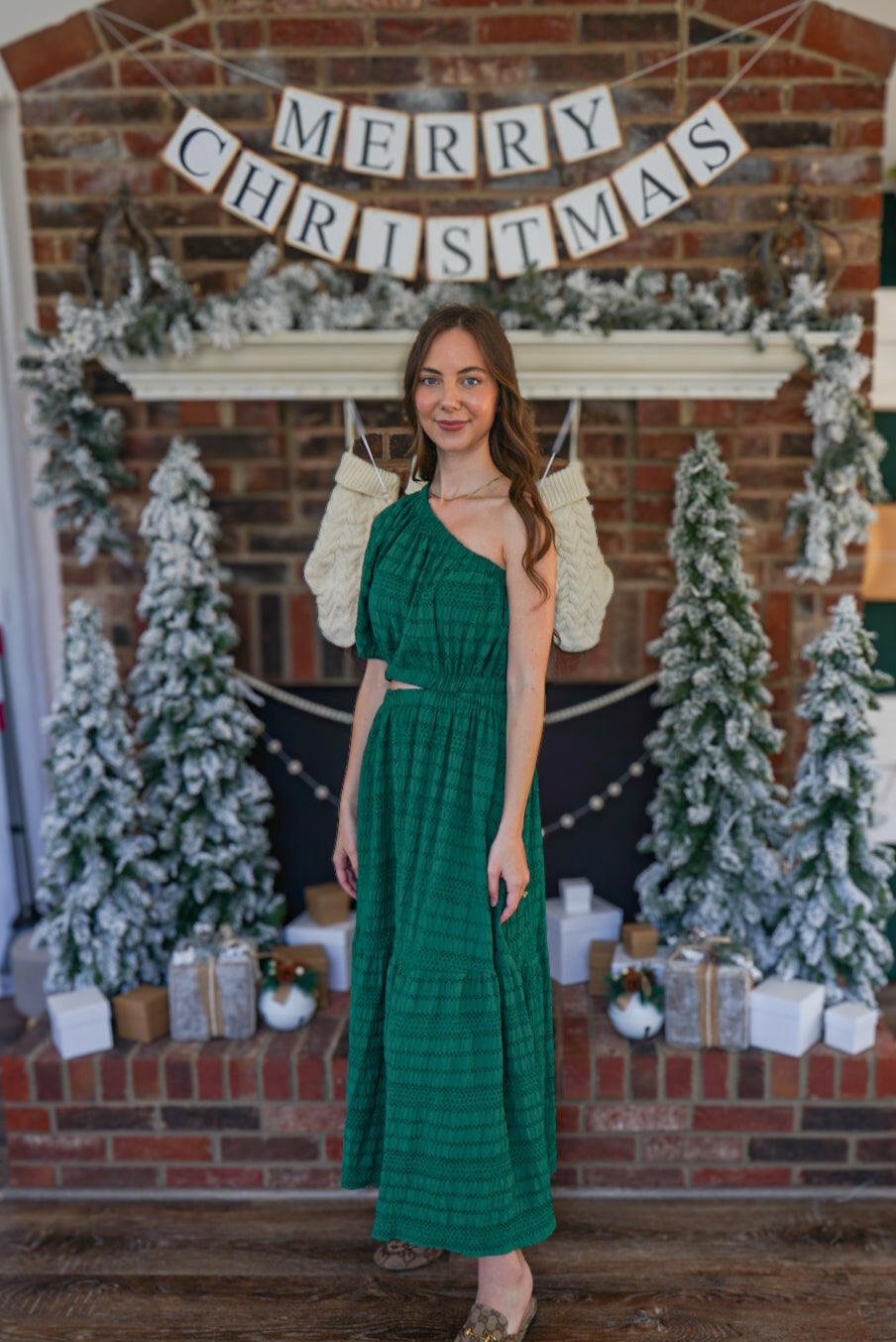 Make a statement in this playful hunter green maxi dress! The one shoulder design, puff sleeve, and side cut out add a unique touch to this tiered, textured woven dress. Perfect for any occasion, this dress will have you standing out in style!