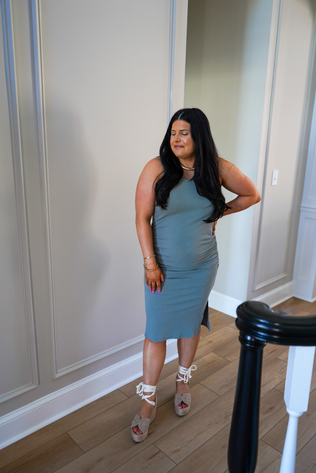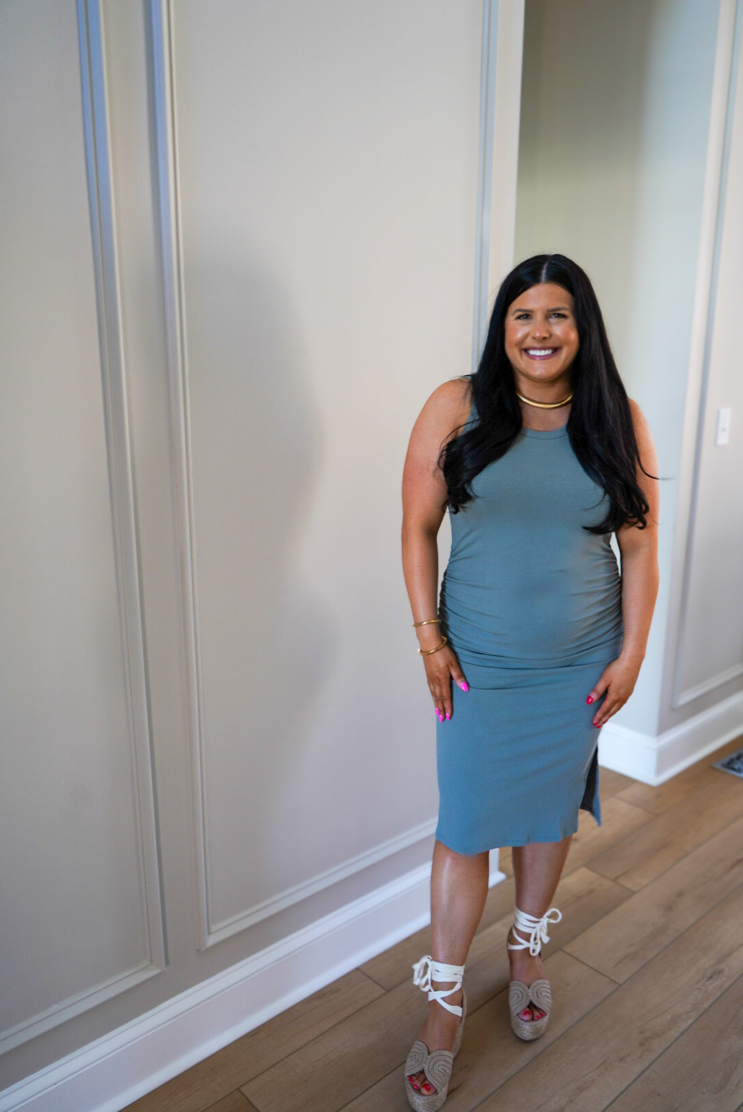 Experience classic style with a modern twist in our Back To The Basics Mint Dress! This ribbed knit dress features ruched detailing and a side slit for added flair. Its fitted, comfortable design is perfect for any occasion, whether you dress it up with wedges or keep it casual with sneakers or sandals. Try it out and elevate your wardrobe today!