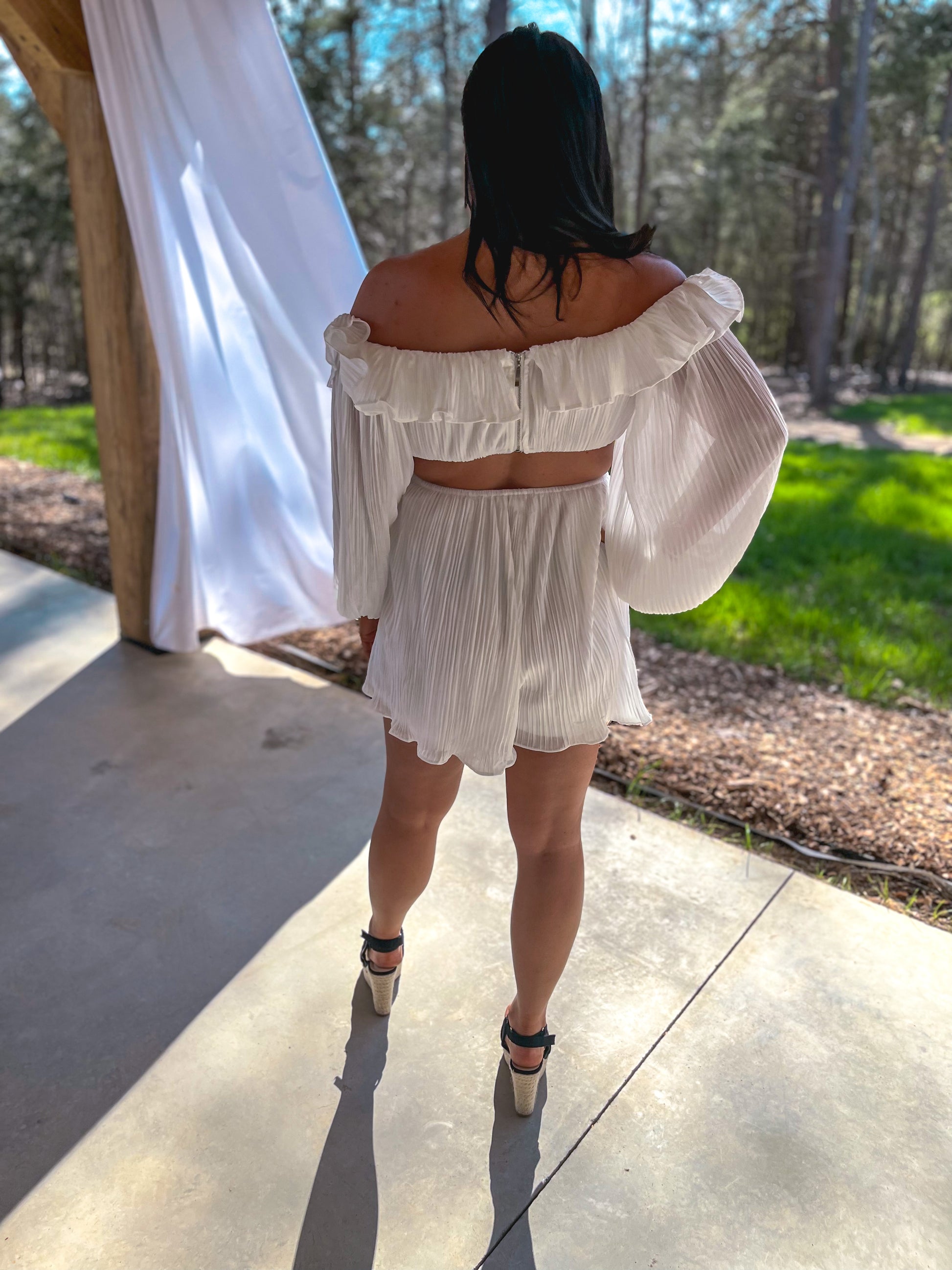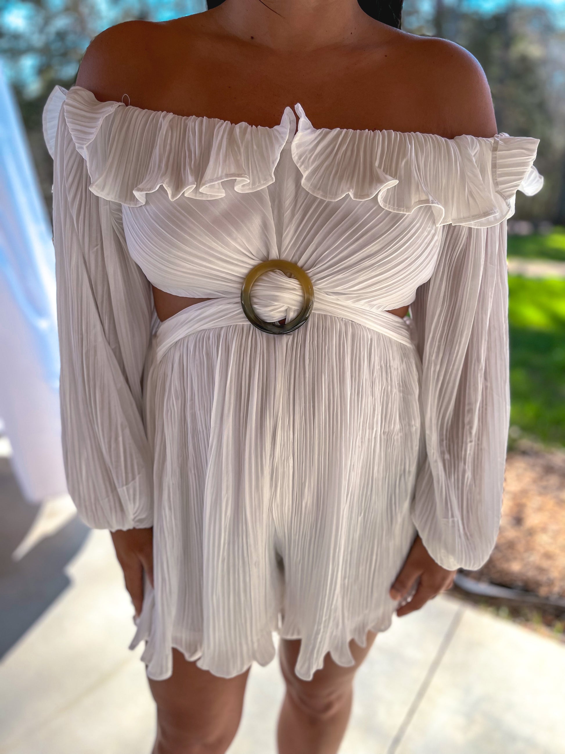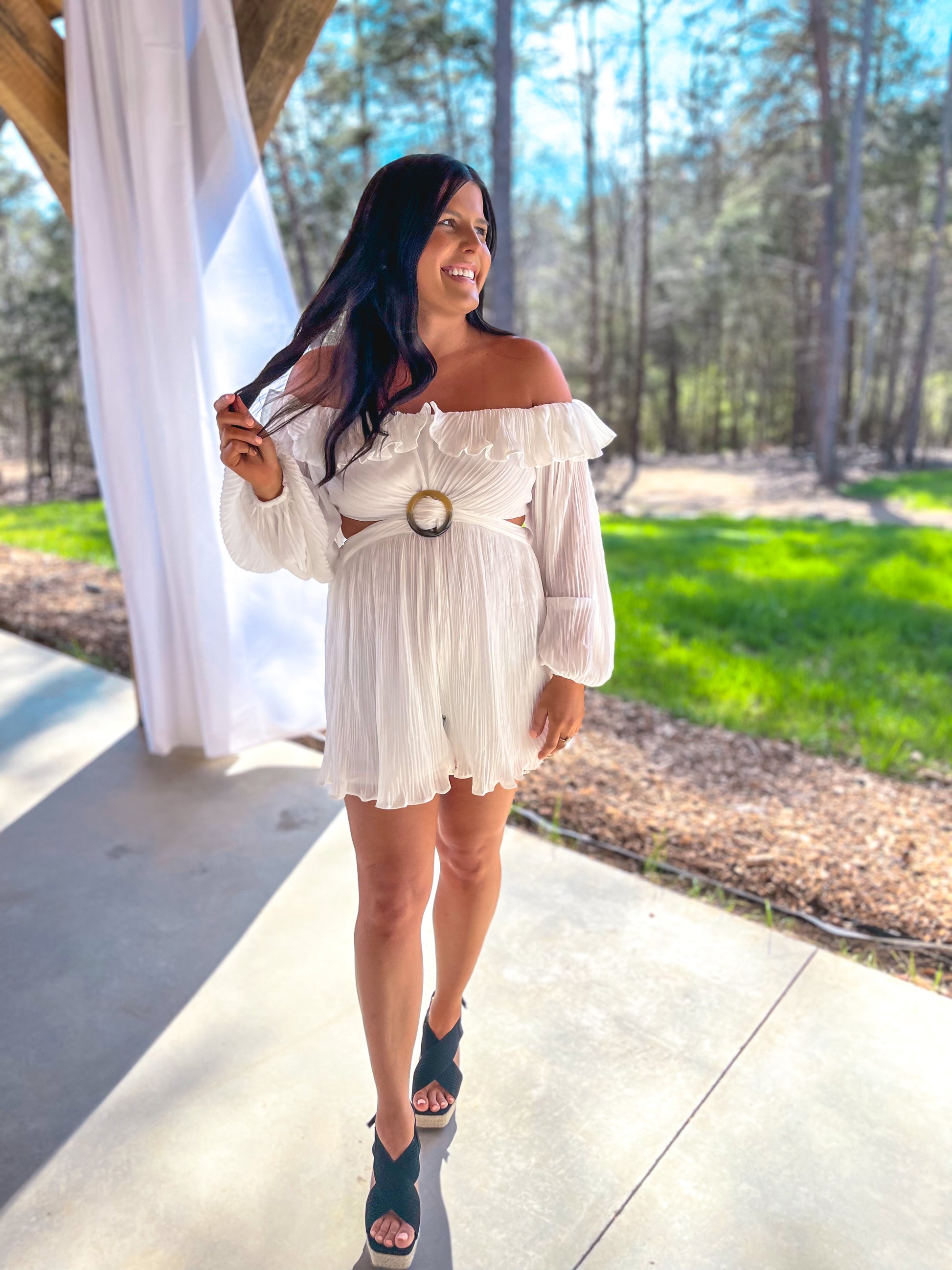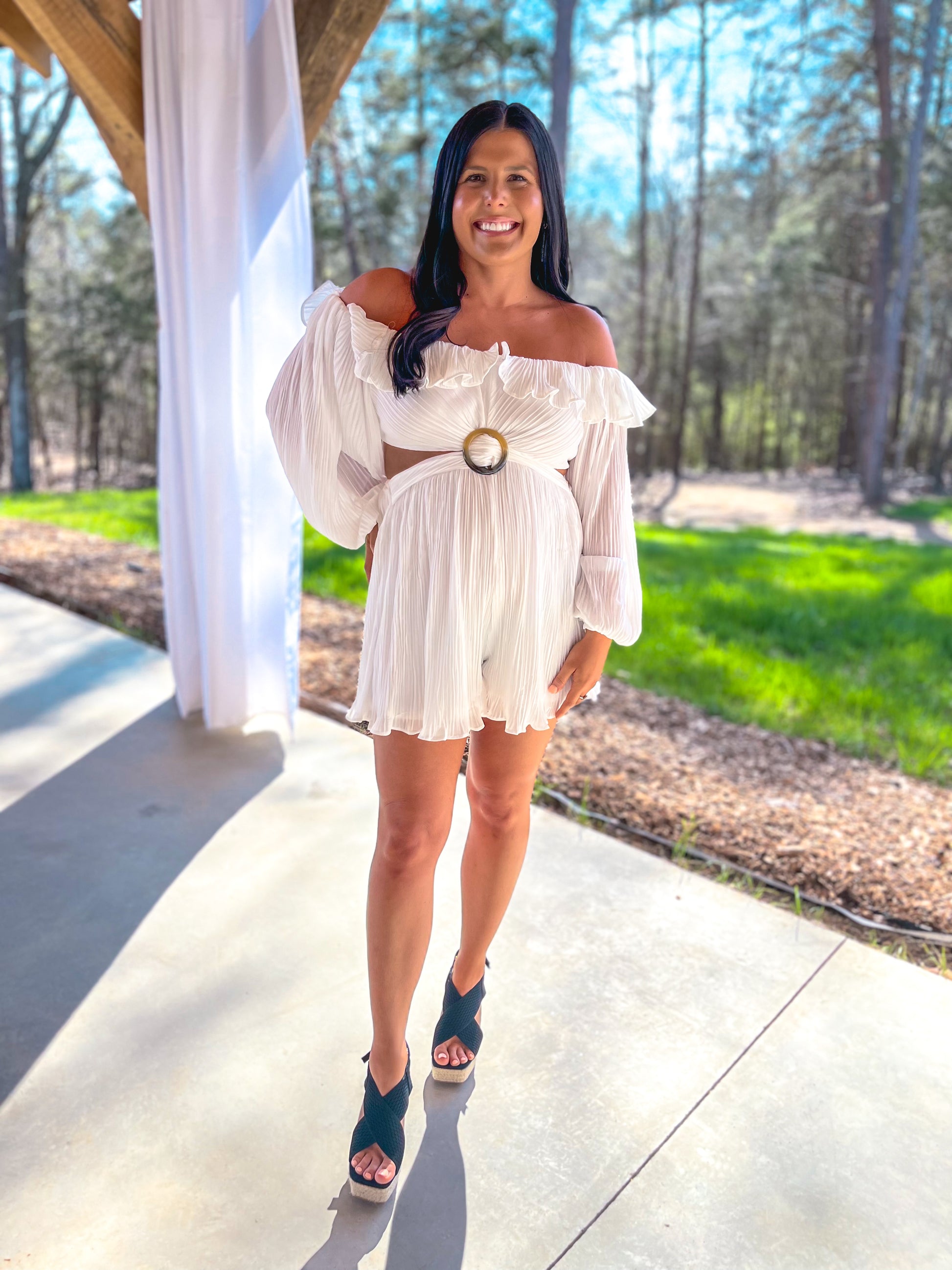 Be the show-stopper wearing our Carrie Off The Shoulder Romper. This white off-shoulder romper features long sleeves, cutout opening waist, back zipper closure, hoop decor and ruffled details - perfect for any bridal occasion or shower. Look fab and chic with this exclusive ensemble!