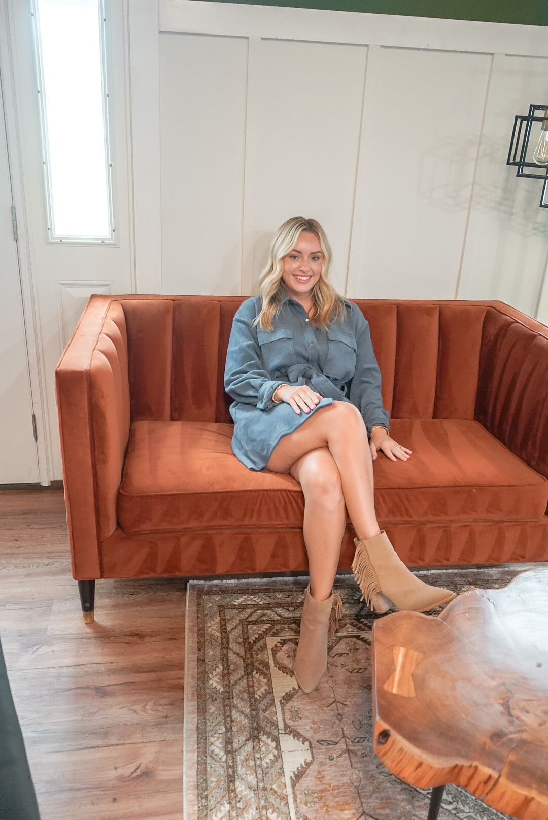 Introducing the Comfy Elegance Denim Corduroy Shacket Dress! Step out in style in this versatile beauty—whether you wear it as a dress or as a jacket, you'll look and feel elegant and comfy! This denim-toned shacket features a soft corduroy fabric with a waist band, making it perfect for any occasion! So, don't wait - rock your way to comfort and elegance!
