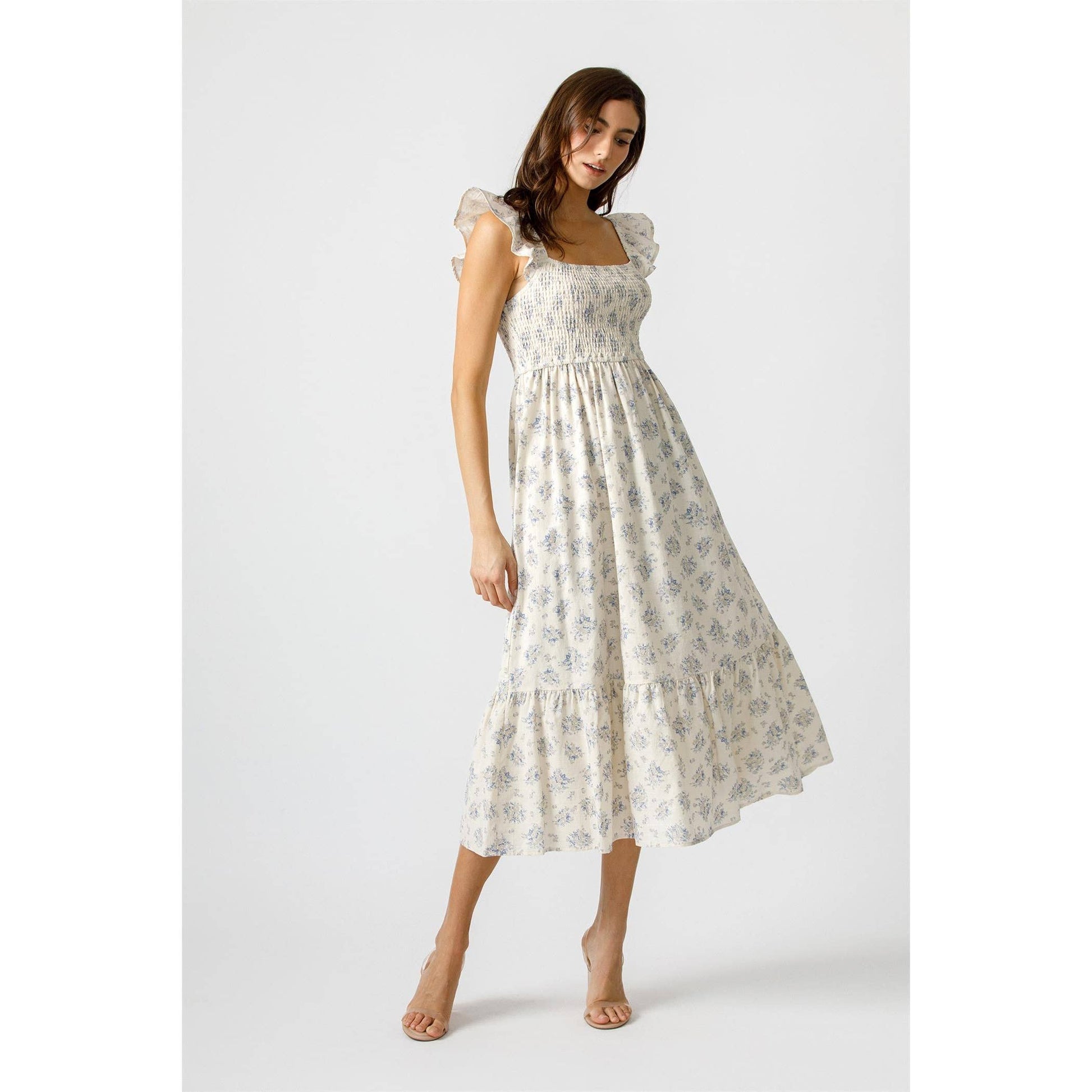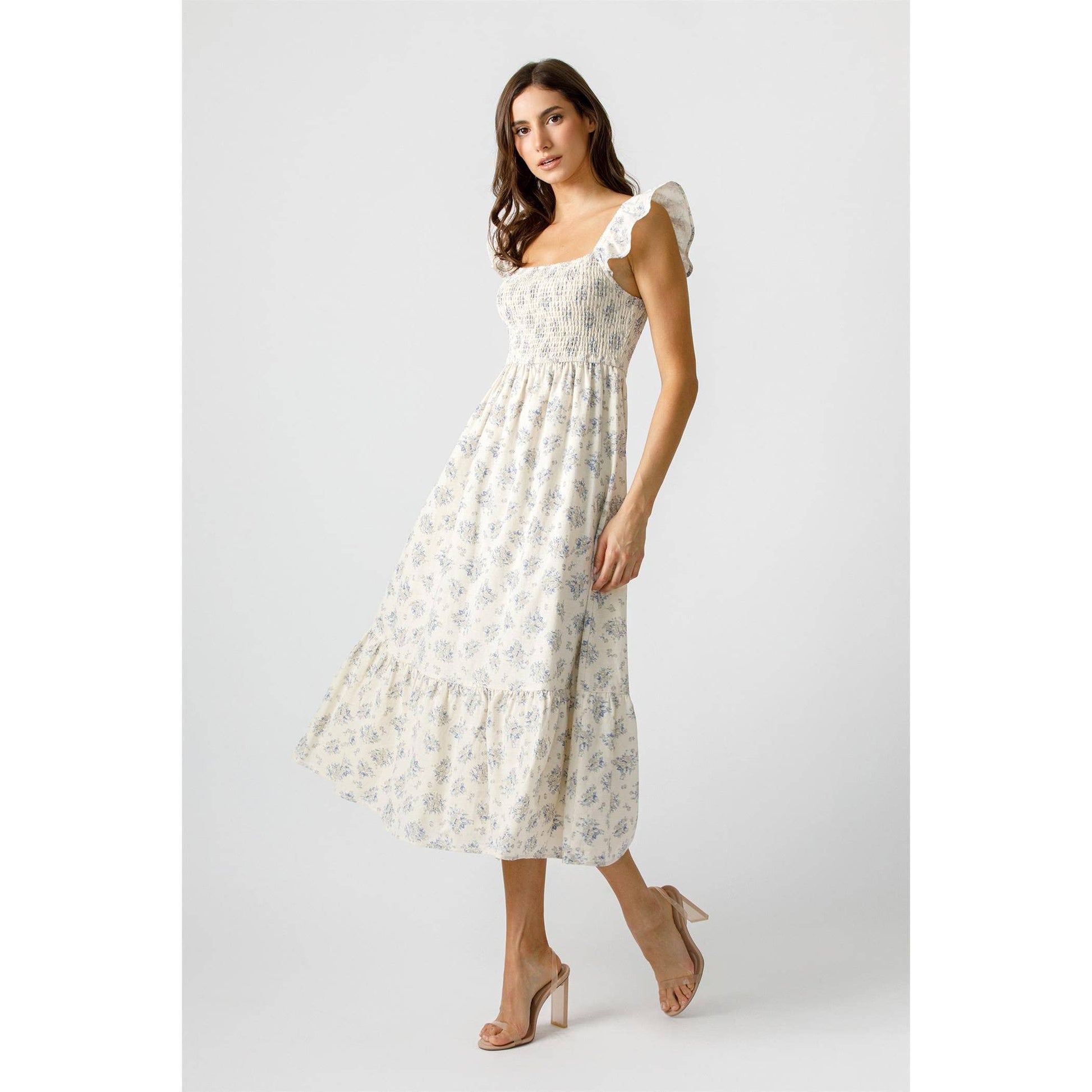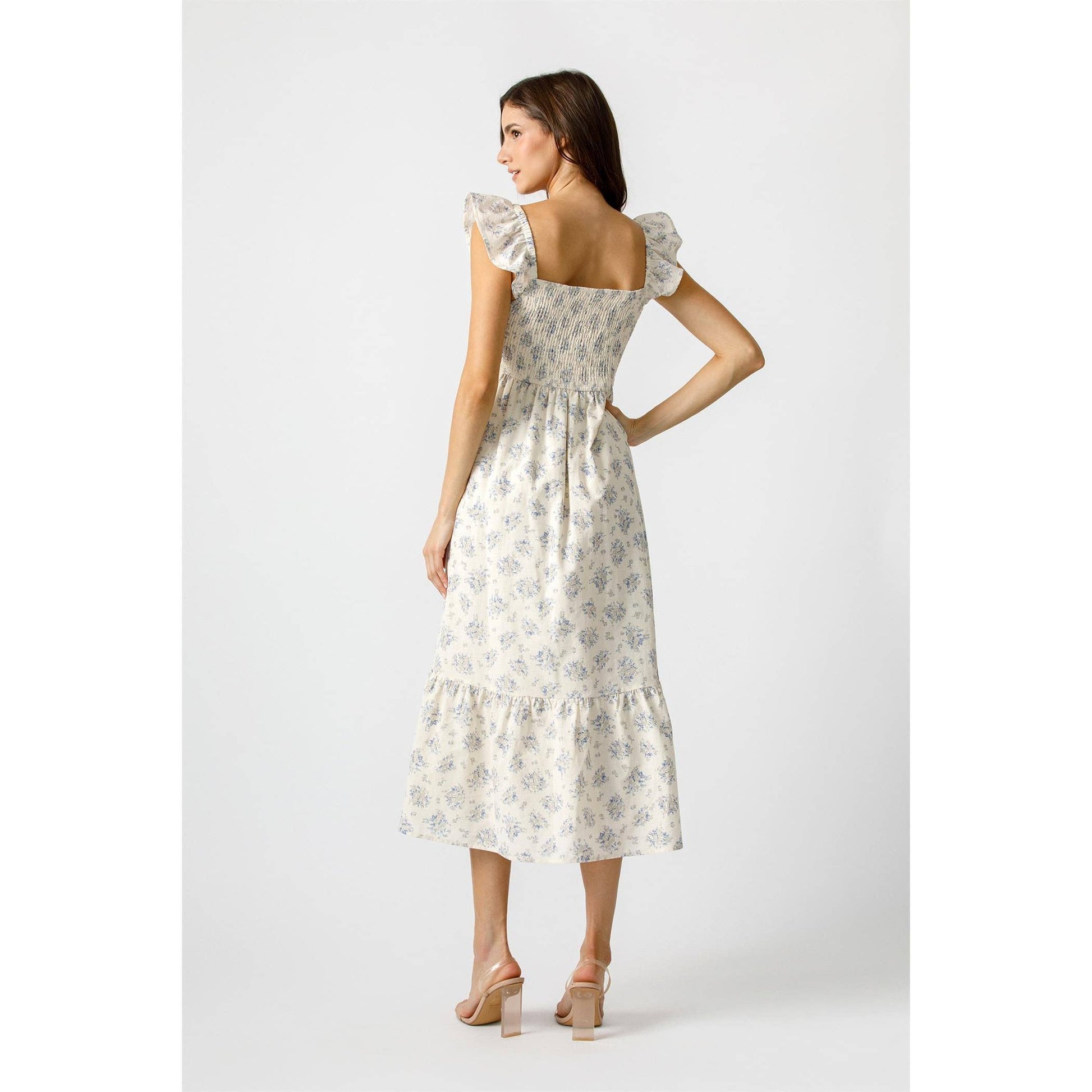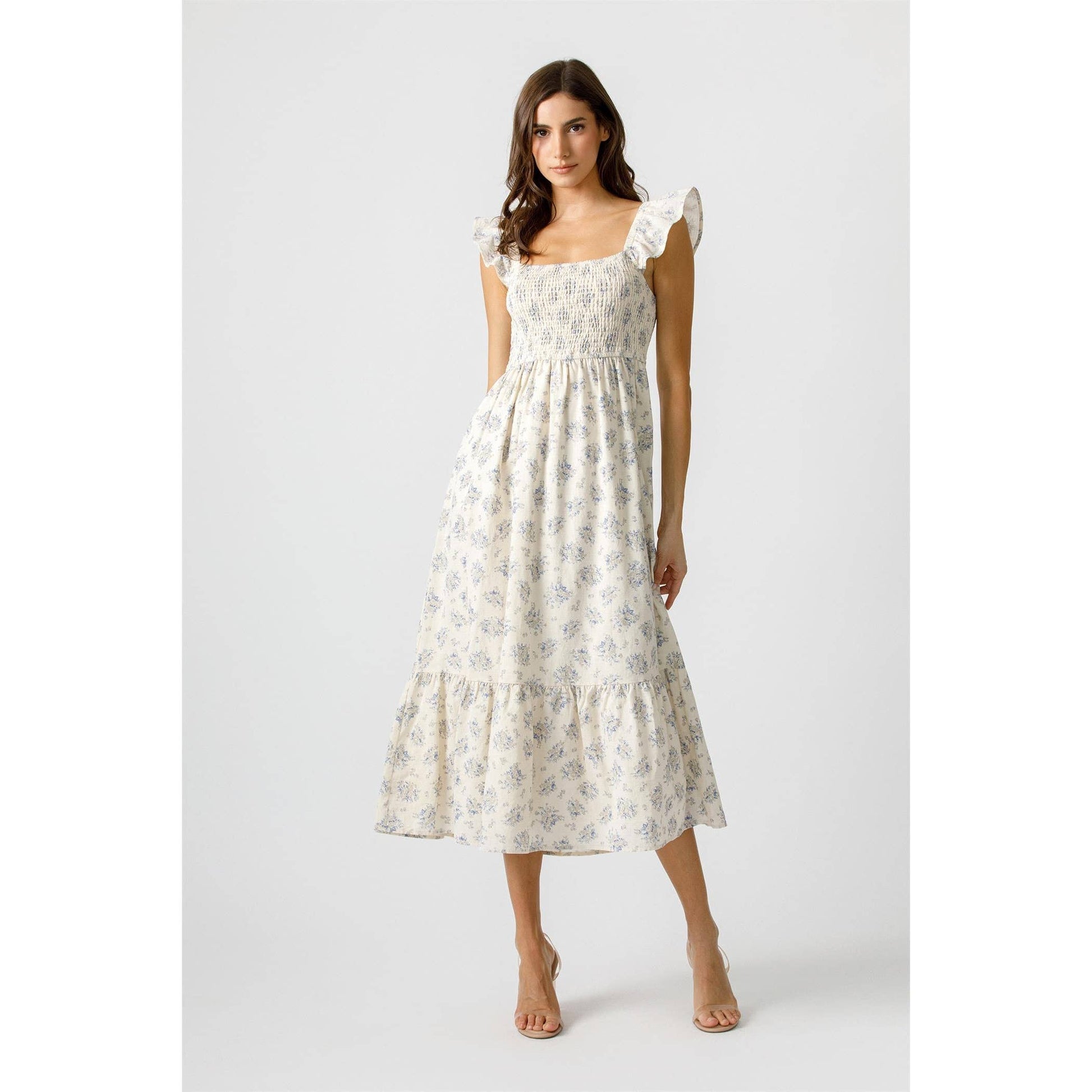 Feel like a breath of fresh air in the Harbor Breeze Dress. This midi dress features a beautiful blue floral print, a smocked bodice for a flattering fit, and tiered skirt for effortless movement. Perfect for sunny days, this dress exudes a vintage countryside charm with its delicate details and fluttery ruffle sleeves.