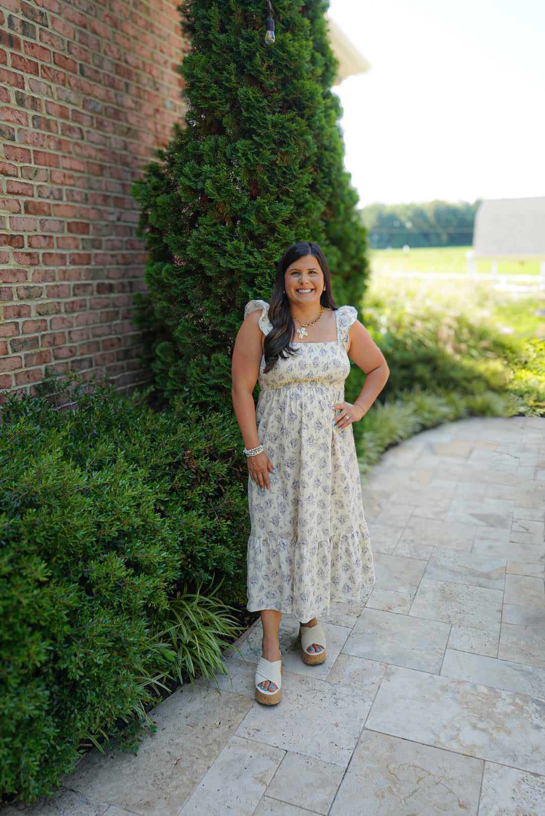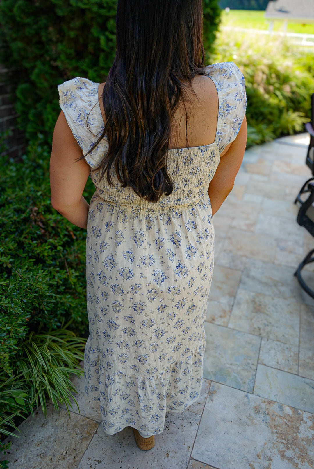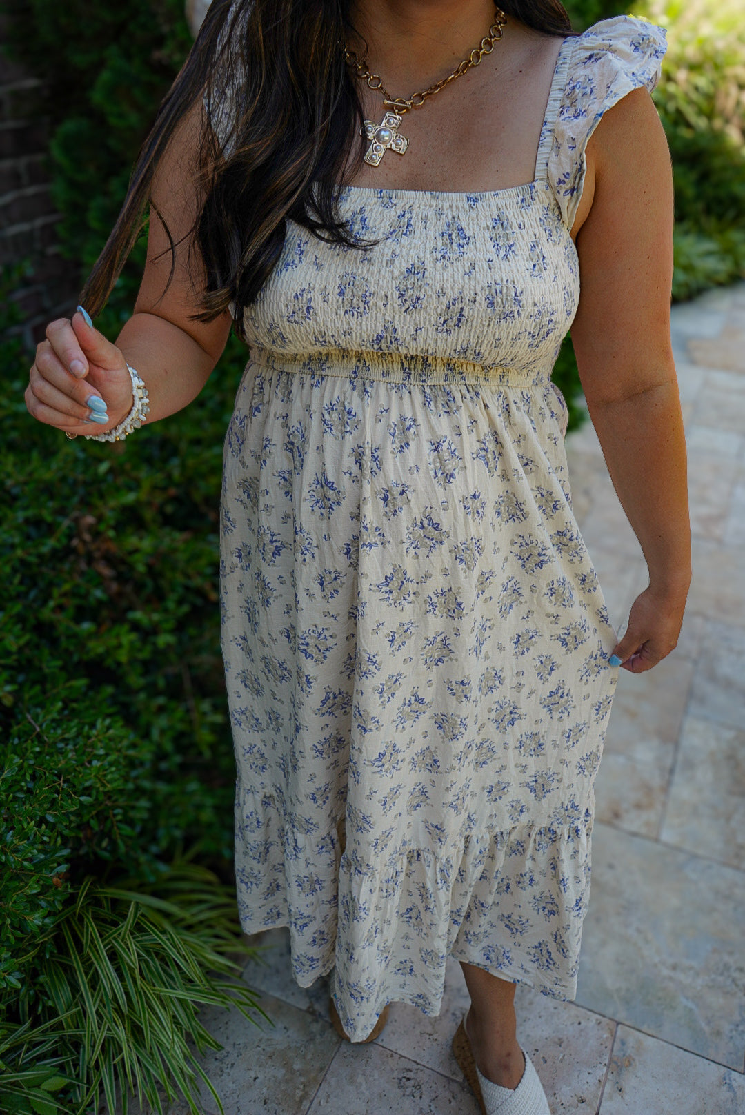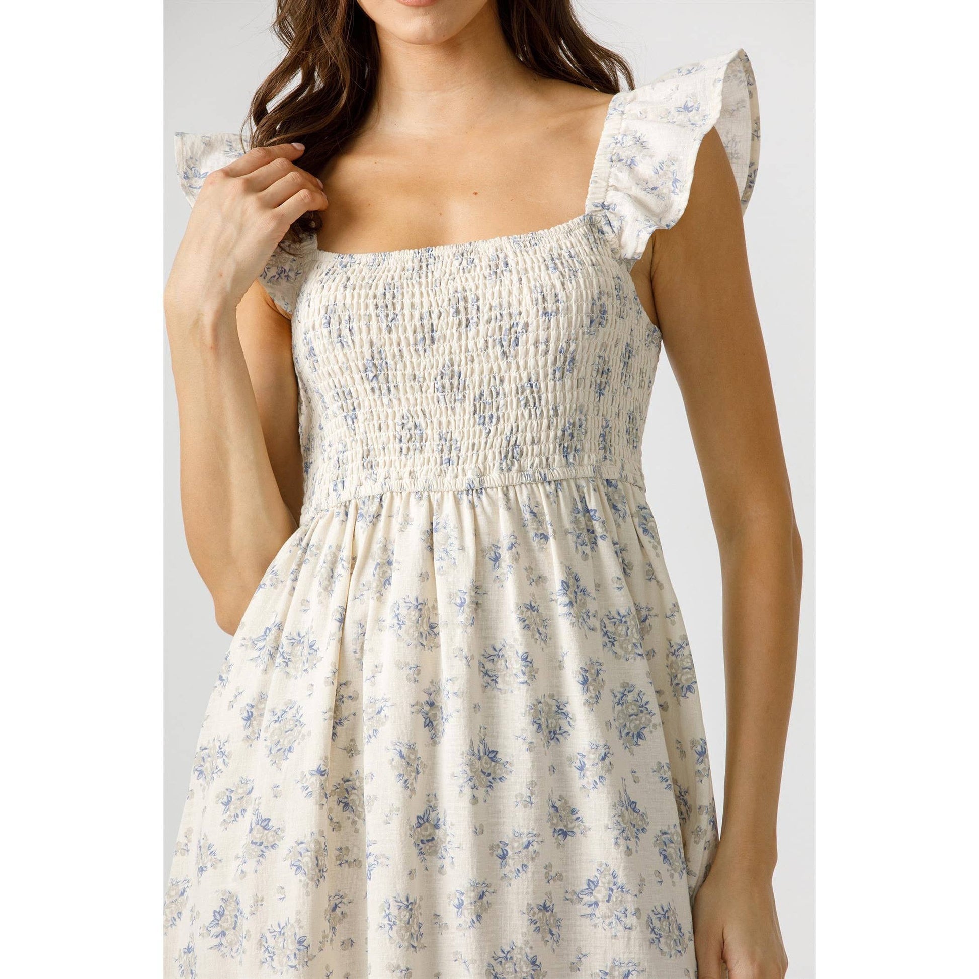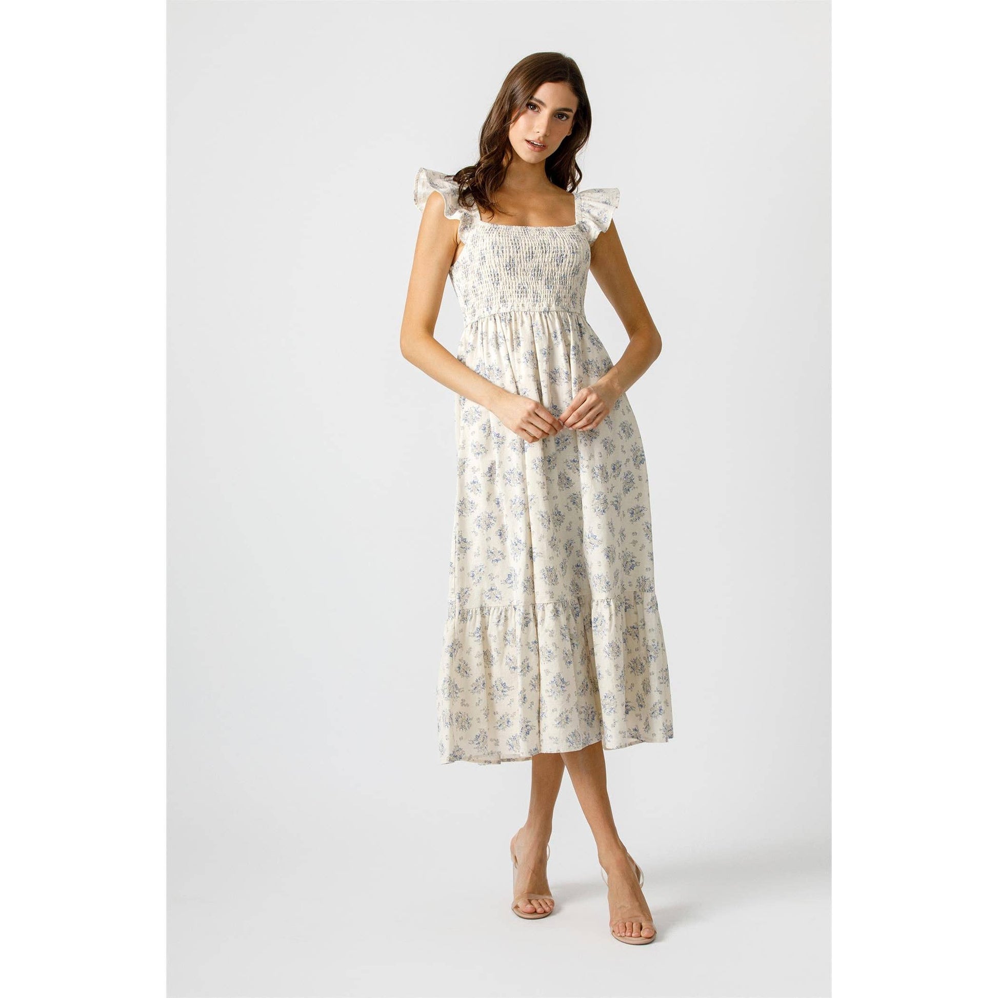 Feel like a breath of fresh air in the Harbor Breeze Dress. This midi dress features a beautiful blue floral print, a smocked bodice for a flattering fit, and tiered skirt for effortless movement. Perfect for sunny days, this dress exudes a vintage countryside charm with its delicate details and fluttery ruffle sleeves.