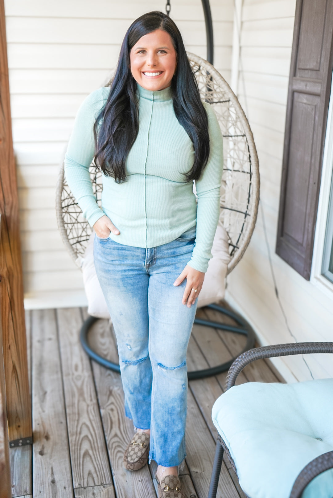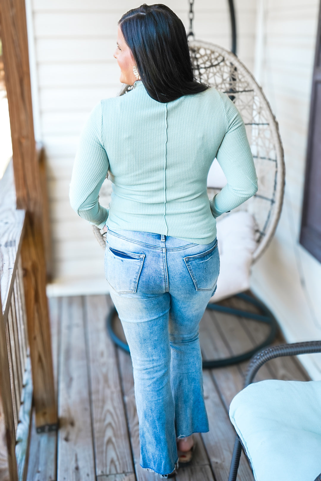 The Happy Haven Iceberg Green Top features a luxurious soft fabric with ribbing throughout, offering a sophisticated look. The high neck and long fitted sleeves create a stunning silhouette, while the curve-hugging bodice is fashioned with seam detailing for a modern design. Look stylish and sophisticated in this beautiful top.