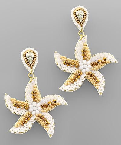 Get ready to shine with these Ivory Bead Starfish Earrings. Made with acrylic, sequin, and glass, these unique earrings will add a touch of beachy elegance to any outfit. With a post design and a length of 3 1/4 inches, these earrings will surely make a statement.