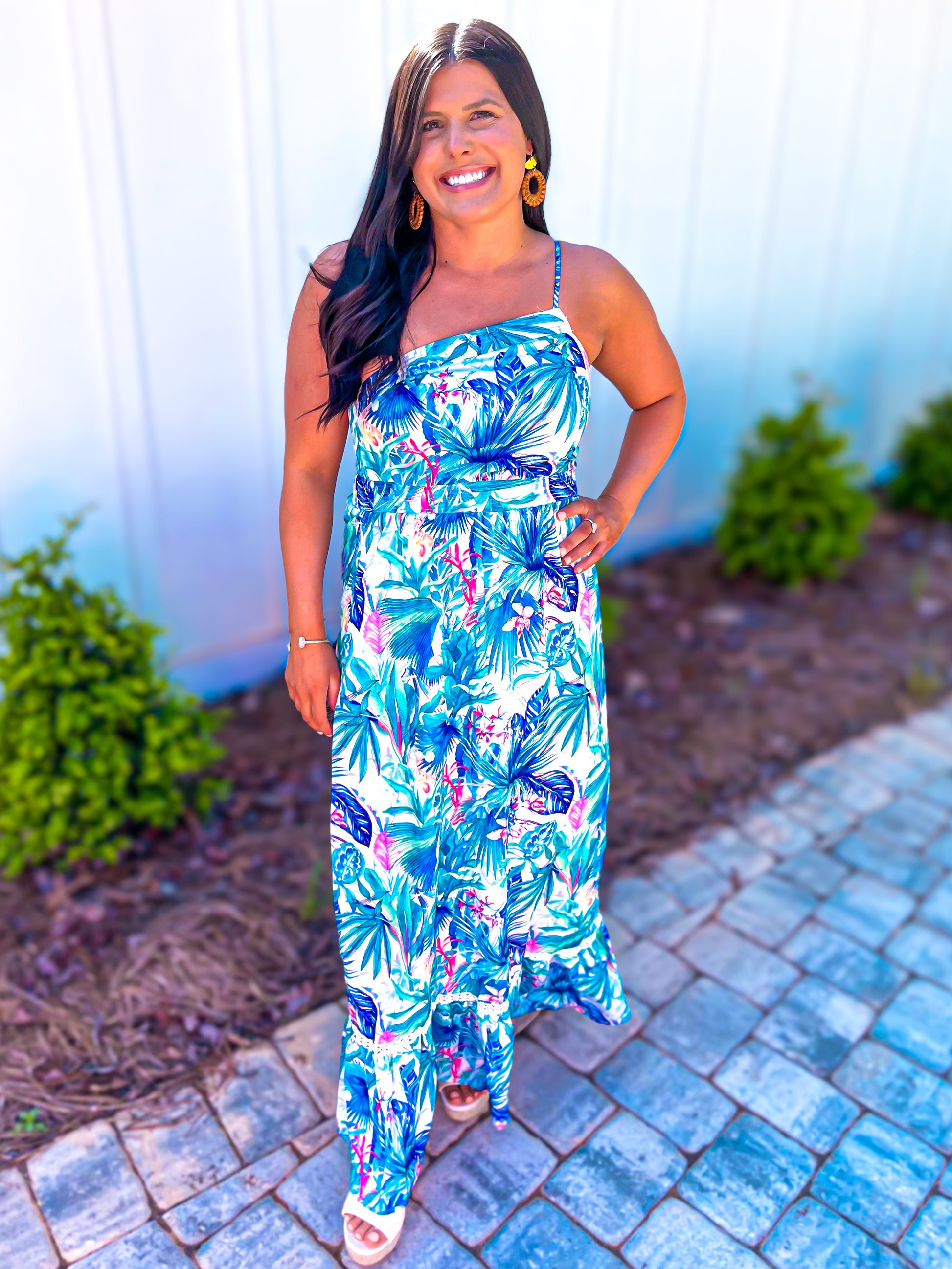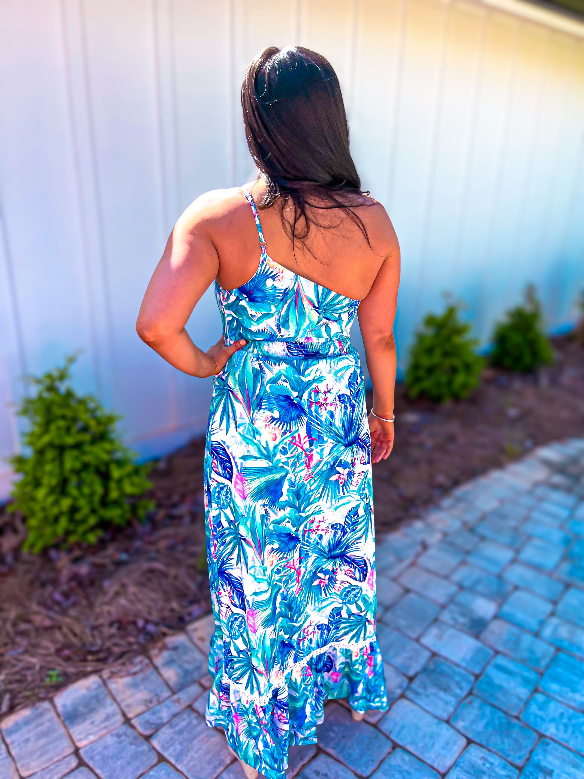 Take your summer style to the next level with the Life's A Beach Dress! This Gorgeous maxi dress is designed with a tropical print, one shoulder spaghetti strap, a fitted yet stretchy waist, and made of 100% polyester. Perfect for any vacation or beach side resort, this dress will have you turning heads all summer long!