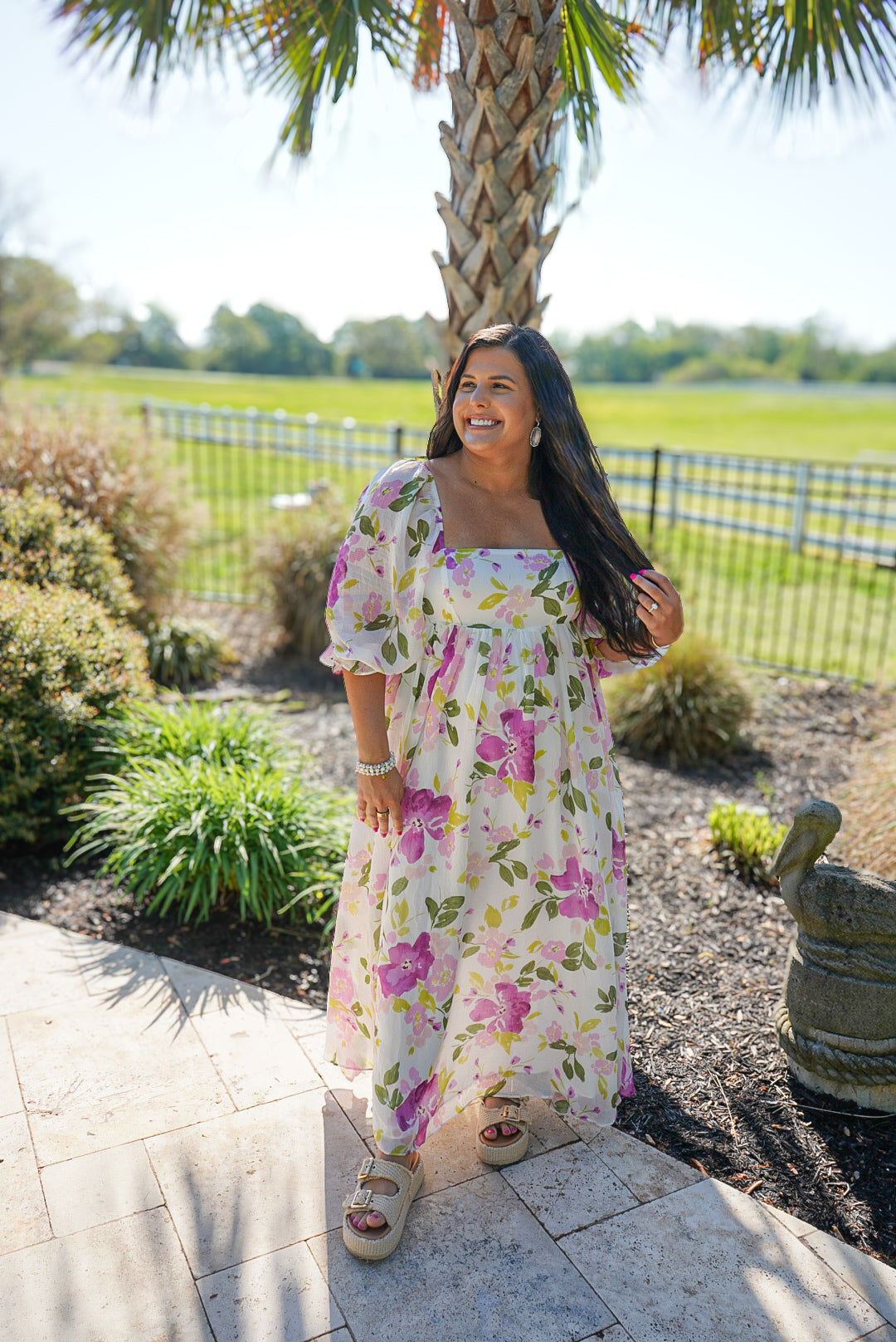 Introducing the Meadow Muse Maxi Dress - the perfect blend of elegance and comfort! This flowy baby doll dress features a square neckline, sheer long sleeves with elastic cuffs, and a gathered waistline for a flattering silhouette. Made from lightweight chiffon, it's perfect for both casual and semi-formal occasions. Stand out in style with the ivory, magenta, and multi-color design. Zipper closure in back