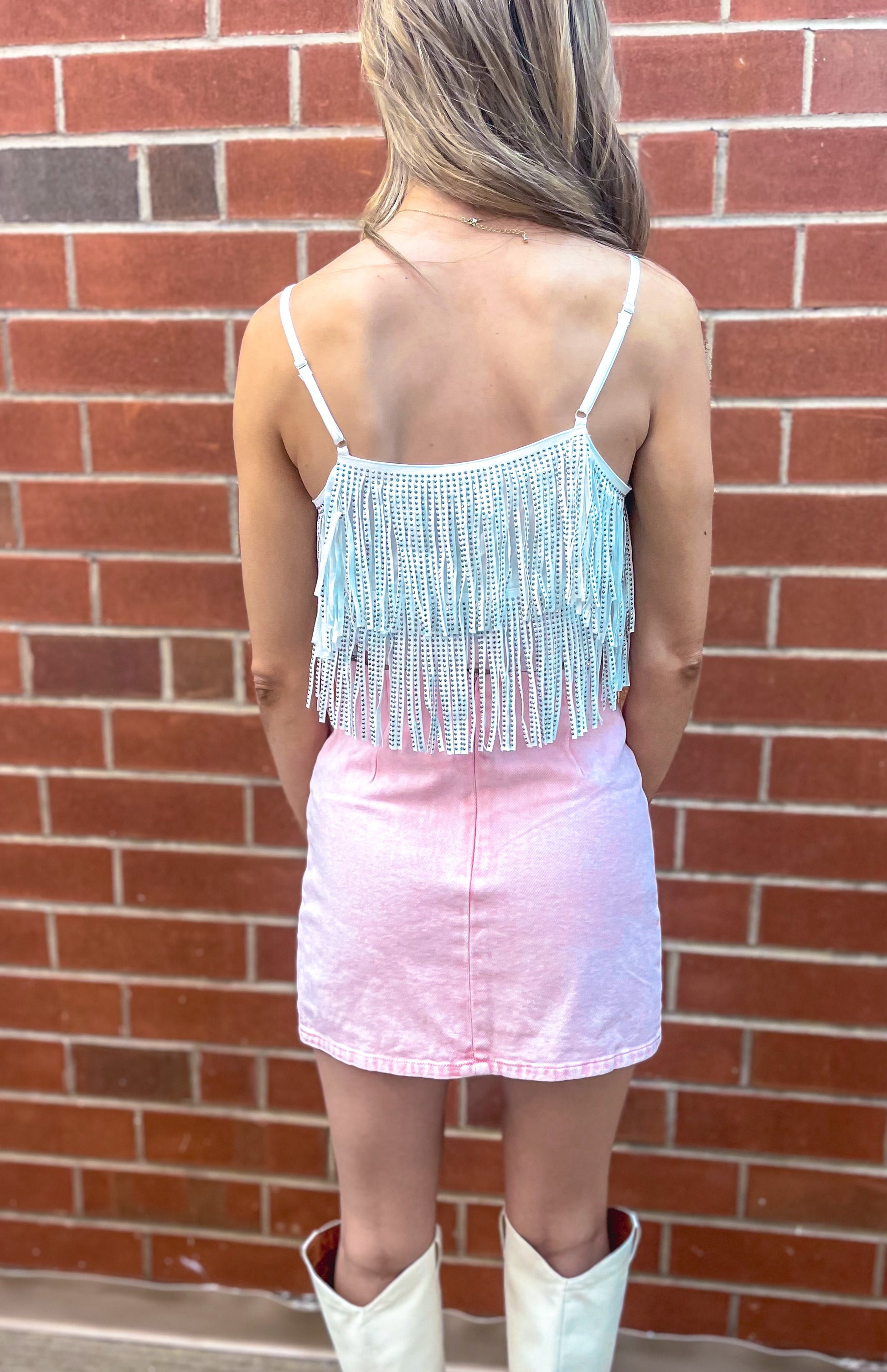 Get ready to sing your heart out in this Nashville Dreams Top! Perfect for hitting the concert, this white rhinestone fringe crop top is sure to turn heads and let you make a statement in flirty fashion. Shine like the star you are!