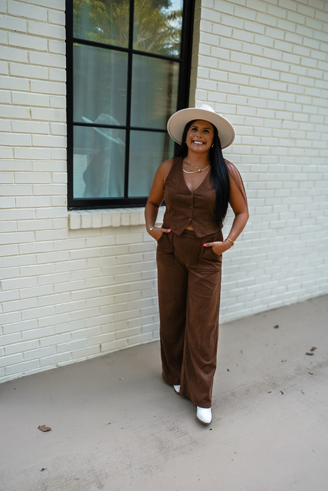 Stay comfortable and stylish with our Olivia Brown Back Banding Wide Pocket Pants! These pants feature a brown elastic waist and side pockets, perfect for on-the-go convenience. Pair them with our Olivia Brown Vest for a complete look.