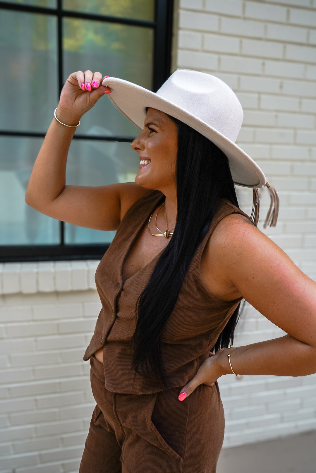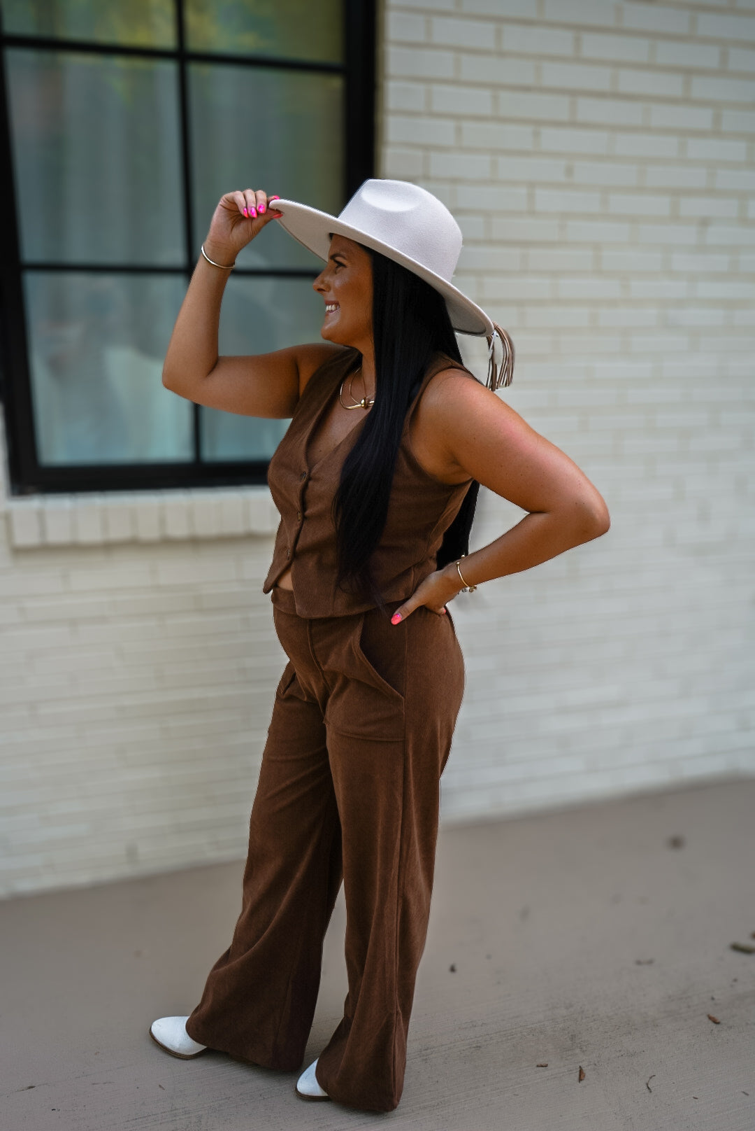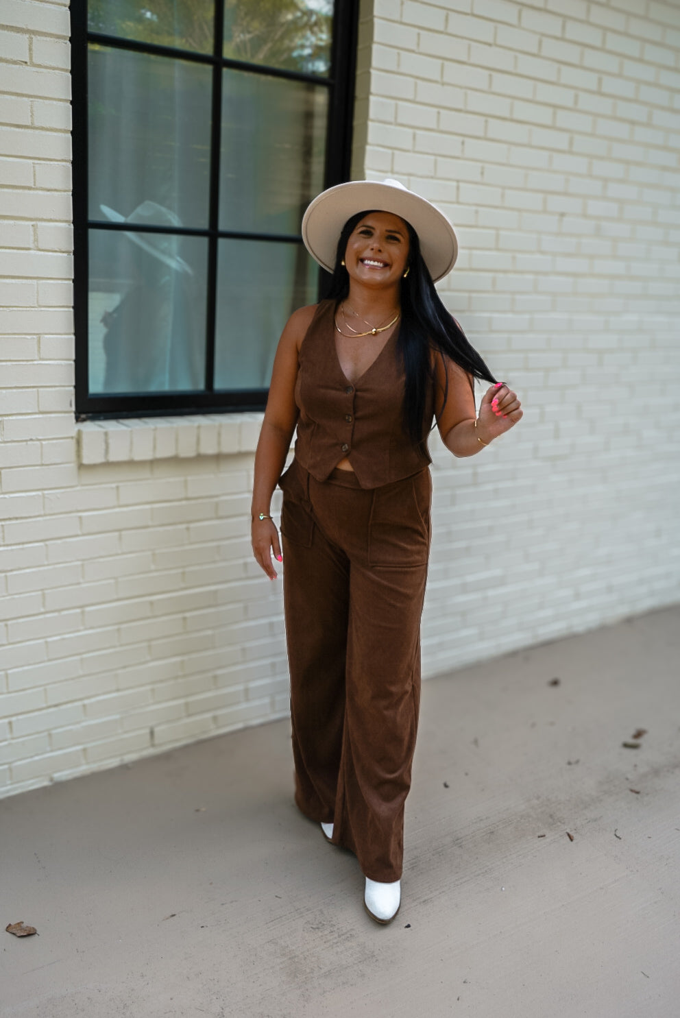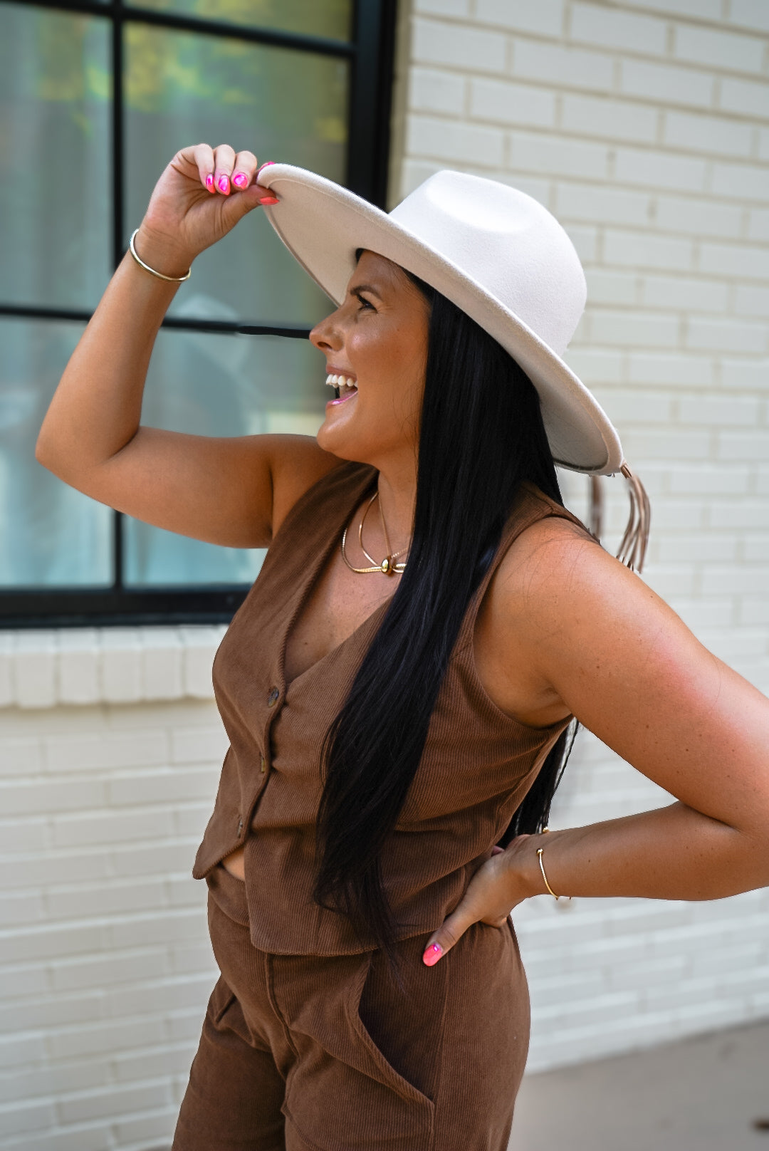Add a playful touch to your outfit with our Olivia Brown Vneck Button Down Vest! This sleeveless vest not only adds a pop of color in brown, but it also pairs perfectly with our brown Olivia bottoms. Unleash your quirky side with this versatile and stylish piece.