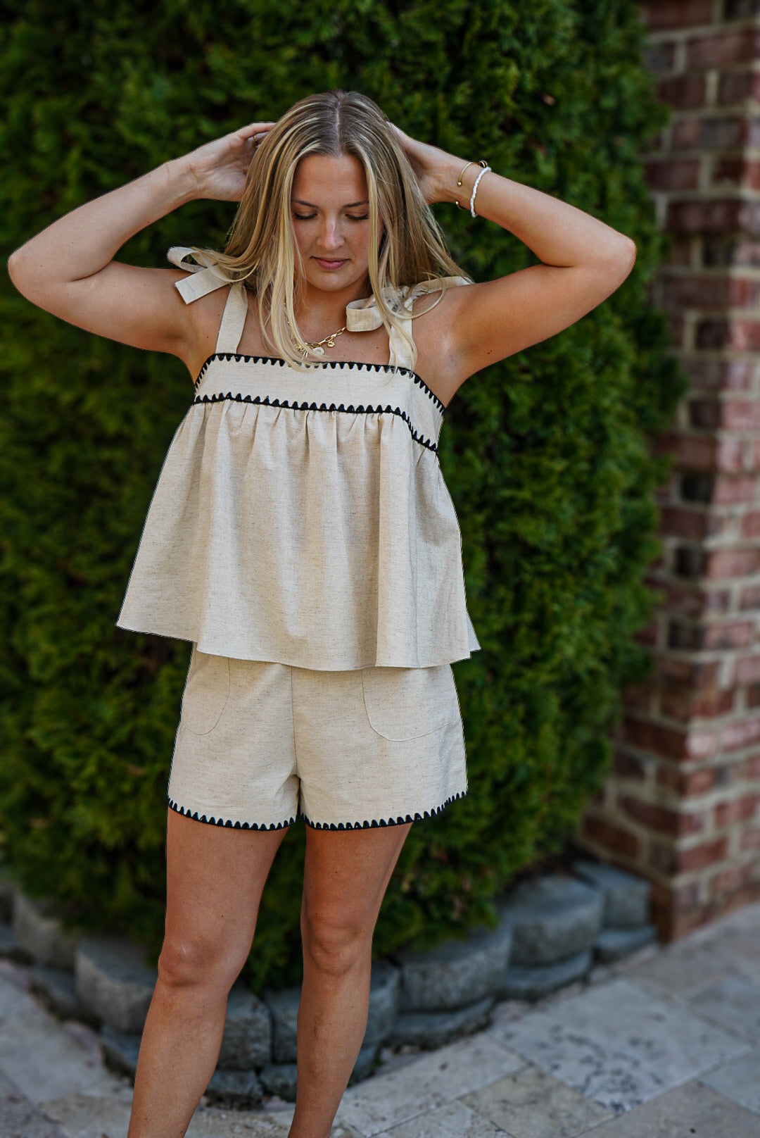 Experience comfort and style with our Out & About Linen Set! The oatmeal and black linen tape detailed tie sleeve top pairs perfectly with the linen shorts featuring side pockets and tape detail. Stay fashionable while staying comfortable all day long.