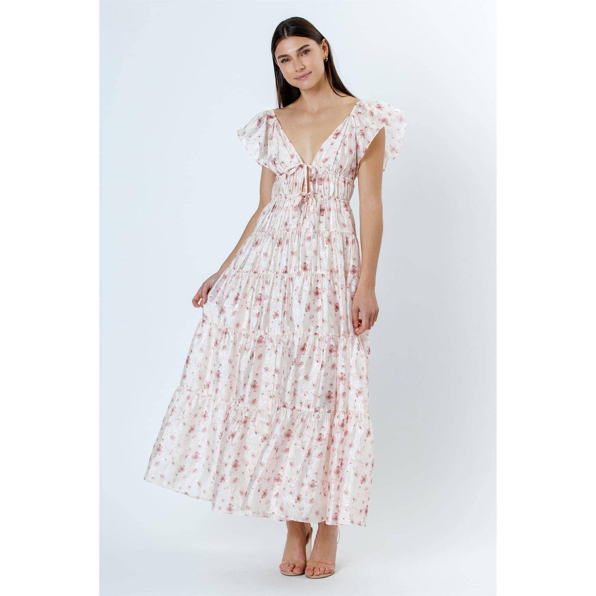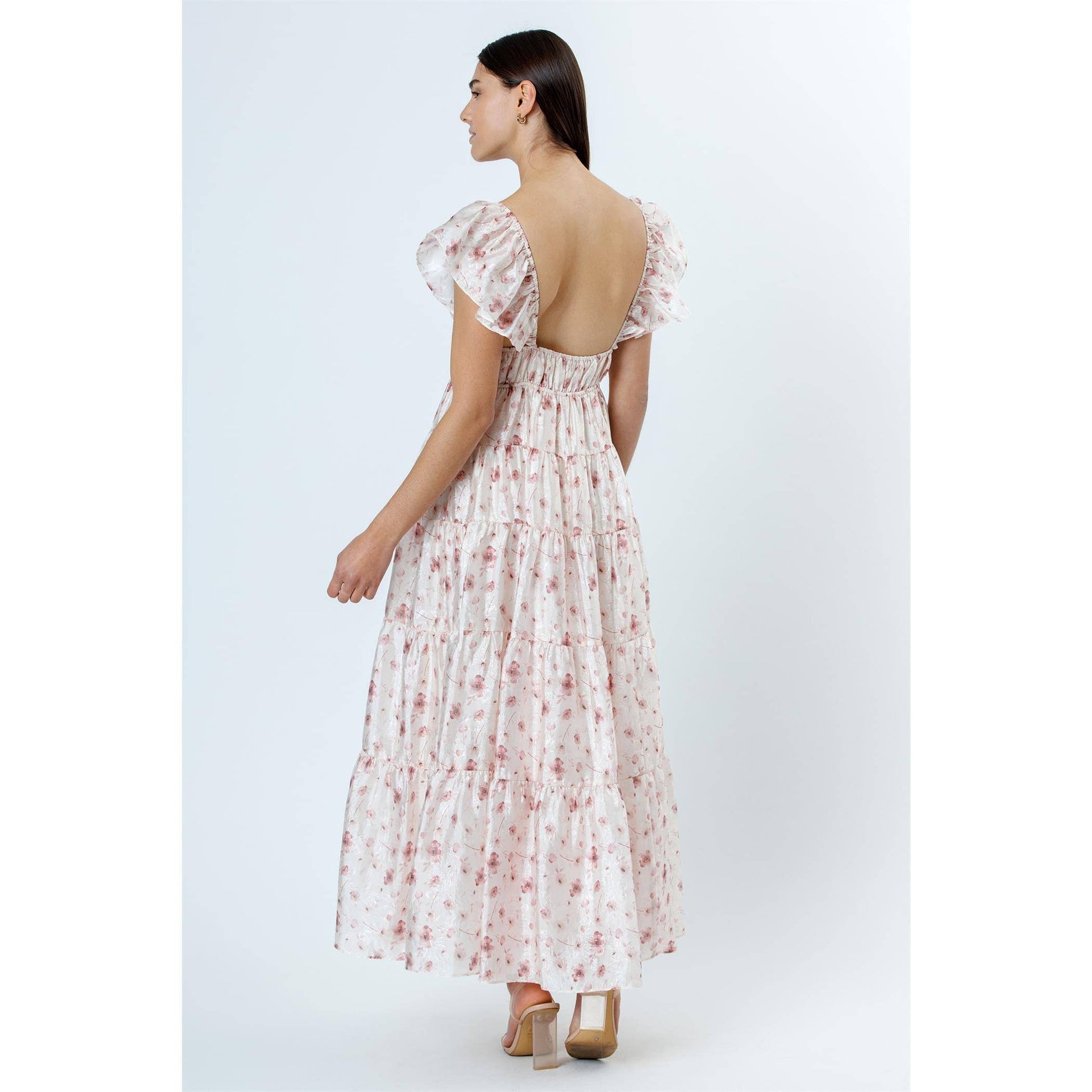 Get ready to channel your inner romantic with the Rosy Grace Maxi dress. Adorned with a delicate pink floral print, the ethereal design features a deep V-neckline, flutter sleeves, and a charming tie detail. The open back and tiered skirt add graceful and alluring elements, creating a dreamy and feminine silhouette.