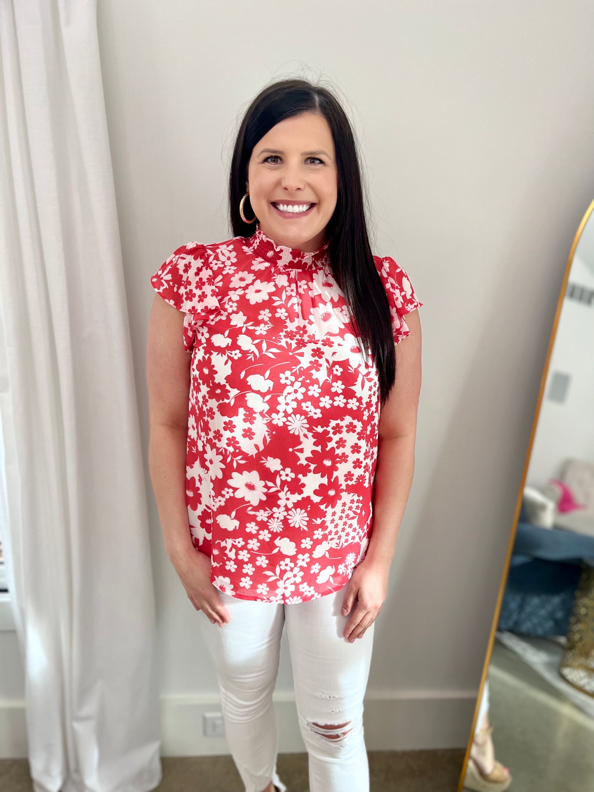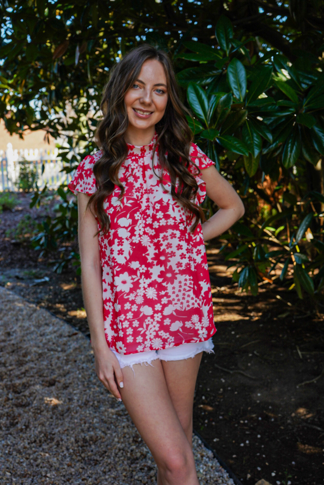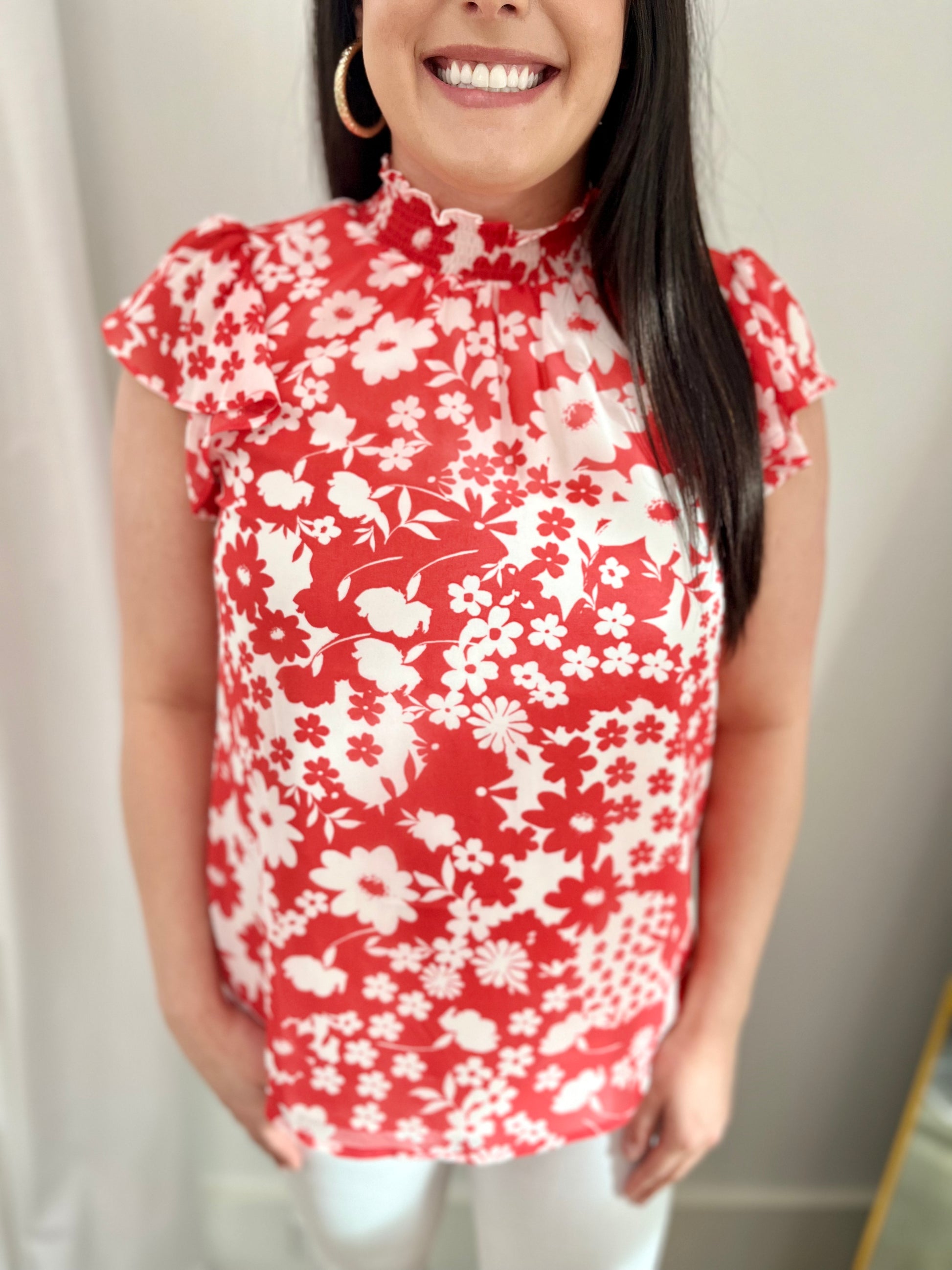 Playful coral flowers shape the classic Mock Neck Blouse. Like it's name, it features a smocked mock neck that tops a relaxed bodice. Flowy cap sleeves frame an effortless silhouette that can easily be tucked into a pair of high rise trousers and paired with loafers.