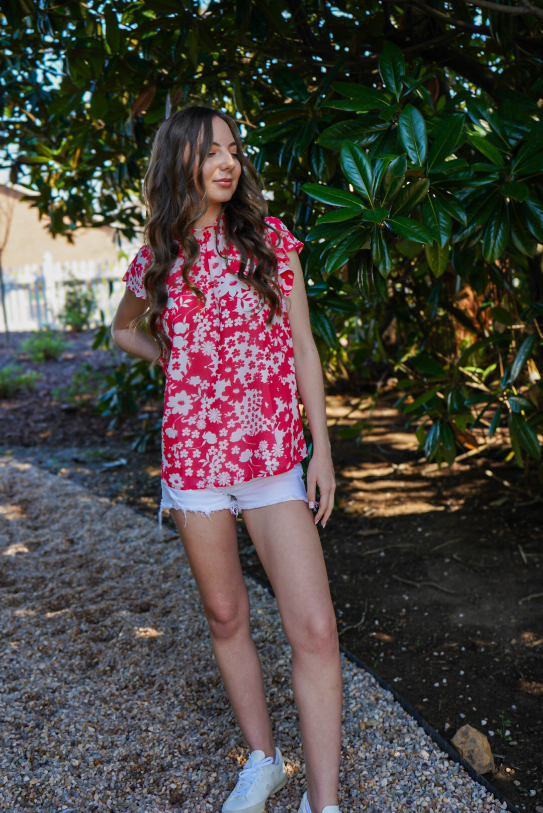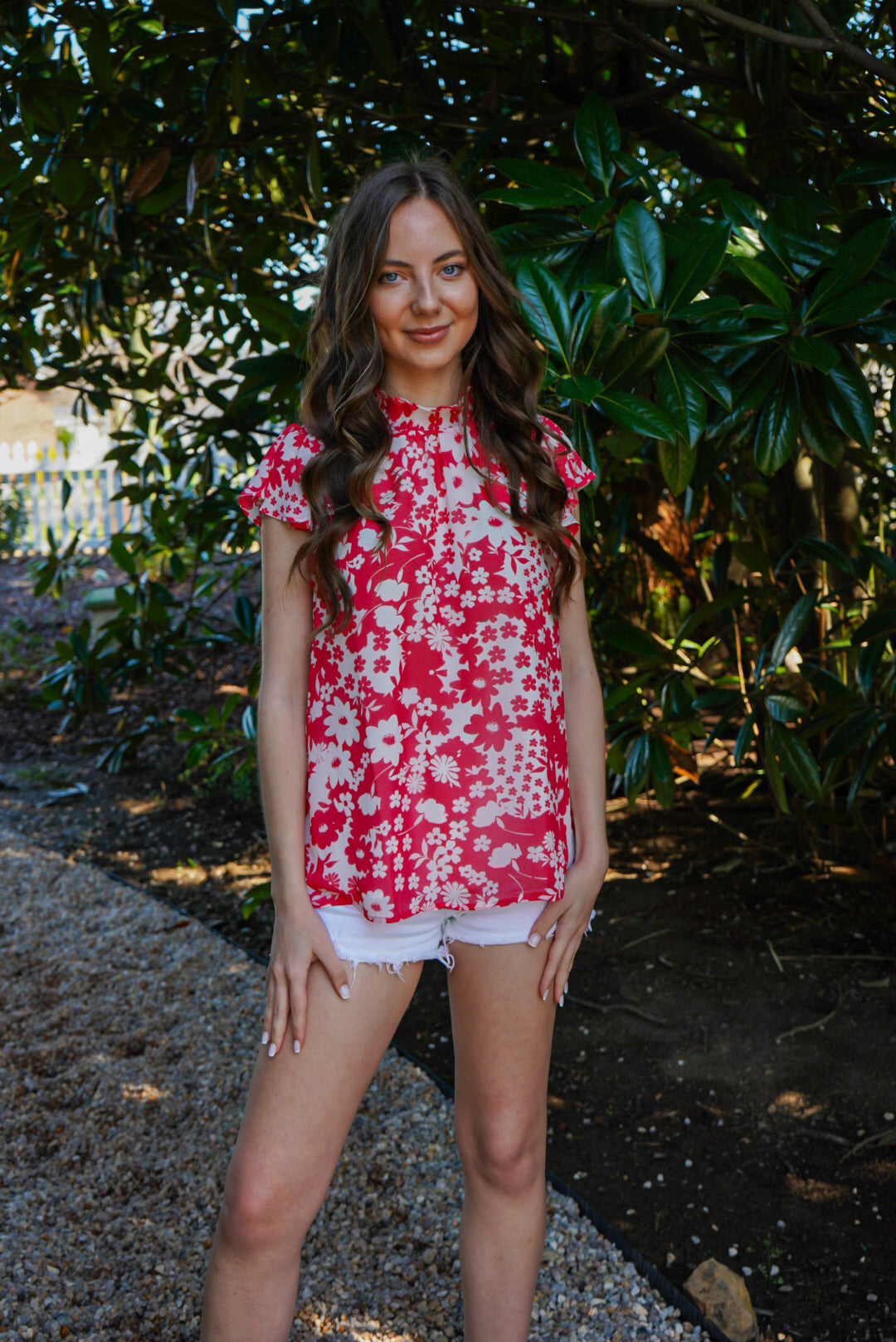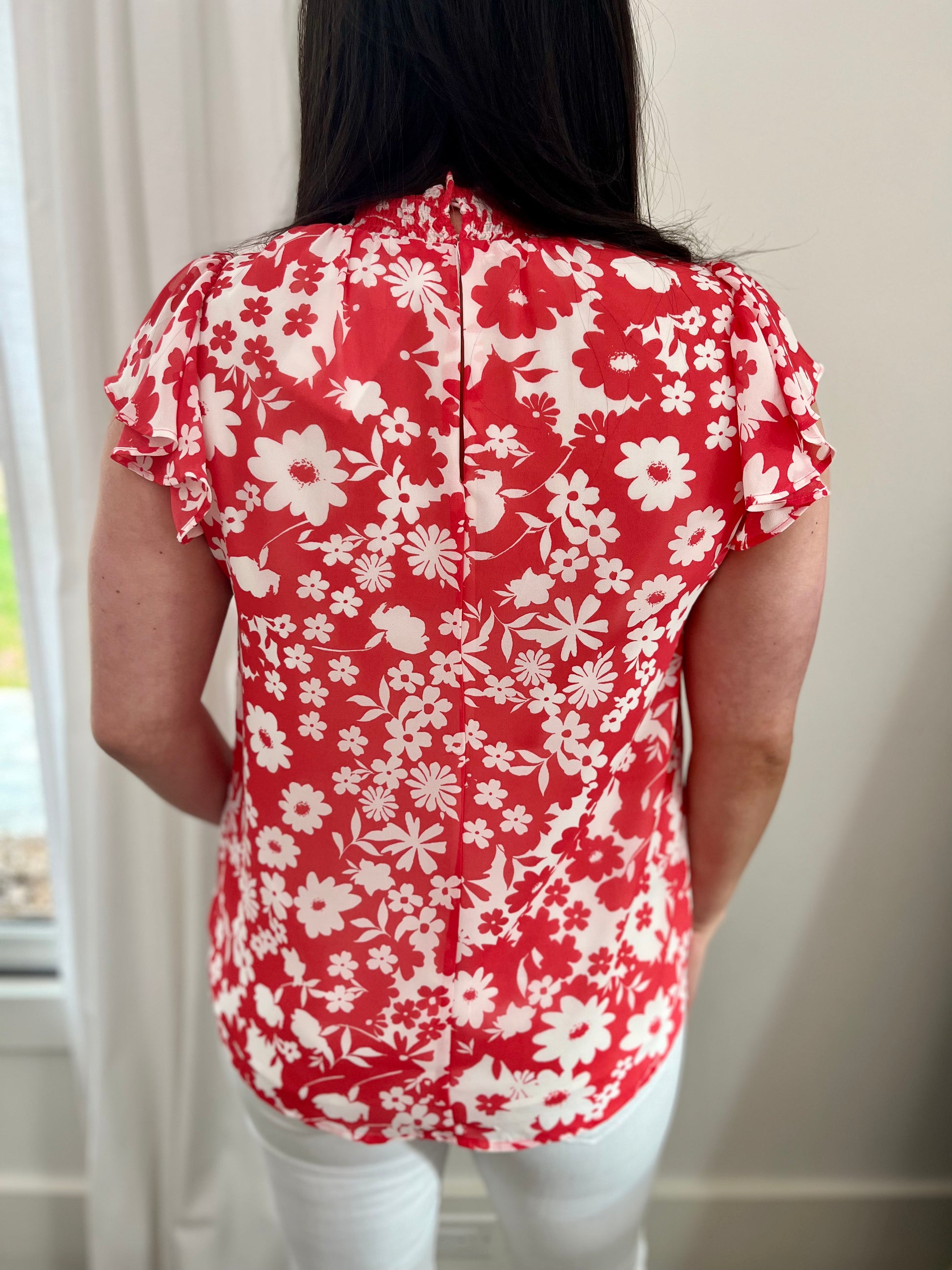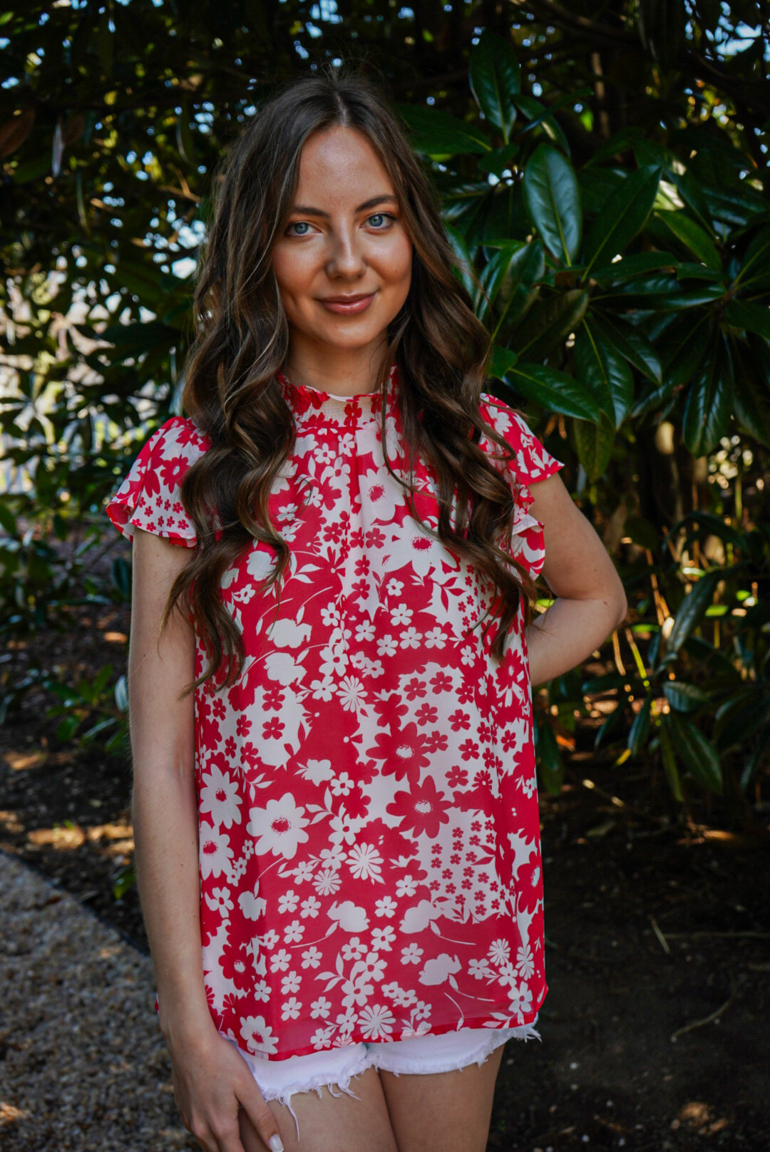Playful coral flowers shape the classic Mock Neck Blouse. Like it's name, it features a smocked mock neck that tops a relaxed bodice. Flowy cap sleeves frame an effortless silhouette that can easily be tucked into a pair of high rise trousers and paired with loafers.