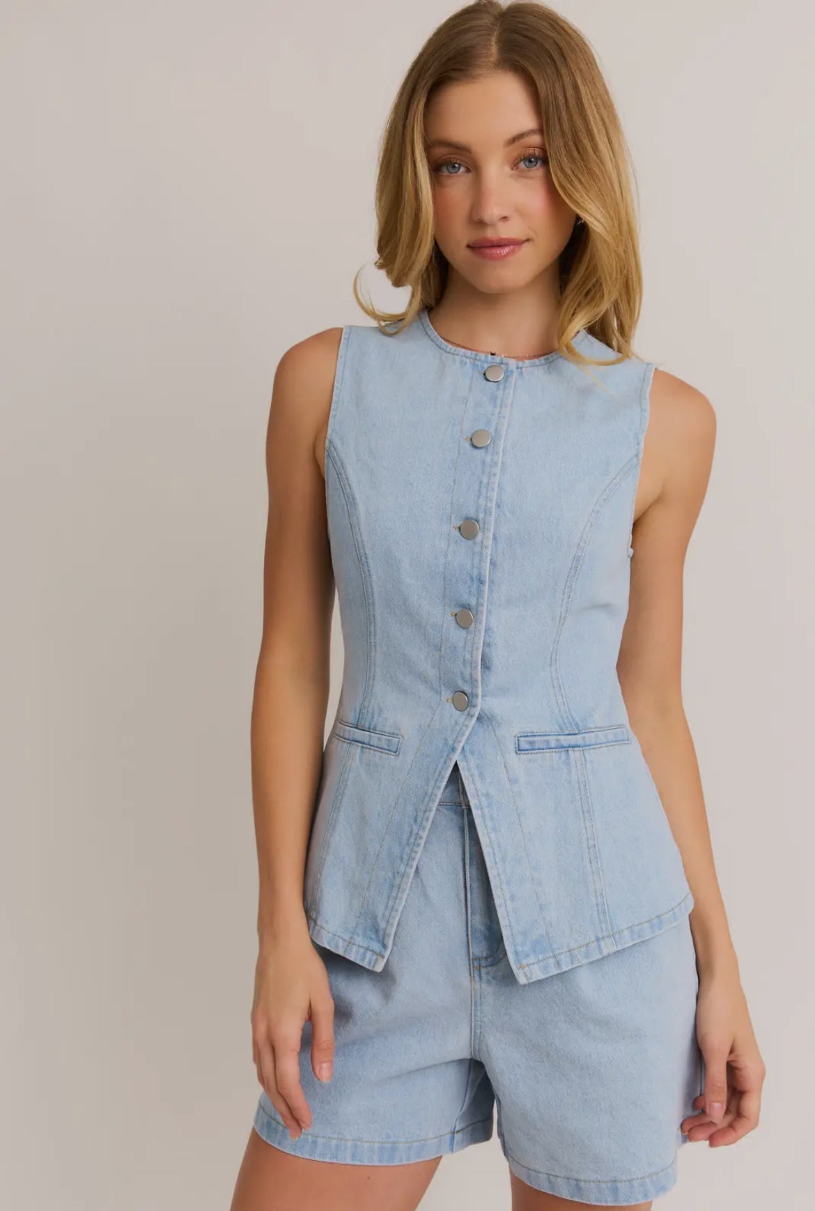 Tailored with charm, the Southern Estate Denim Set is your go-to denim set for sunny workdays or weekend getaways. Featuring pleated high-waisted shorts and a sleeveless button-front top, this look pairs structured sophistication with a laid-back country vibe. It’s classic, crisp, and effortlessly elevated—perfect for those who live for timeless summer style.