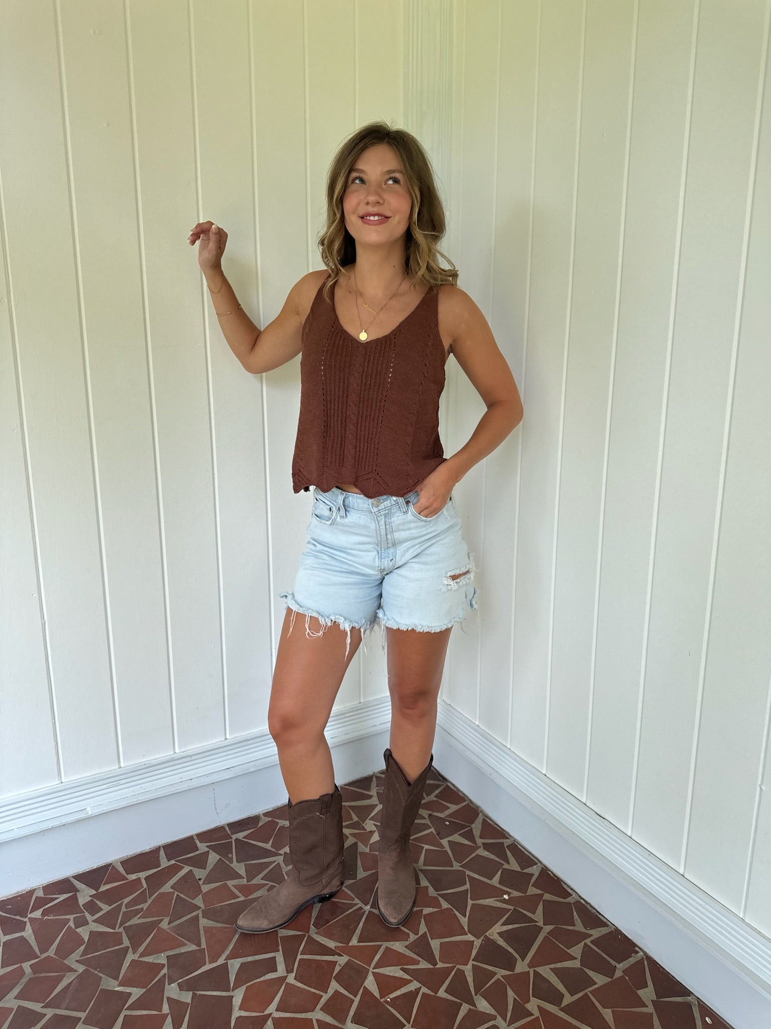 Elevate your wardrobe with our Stella Sweater Tank in Brown! This crop v-neck tank top features a scalloped hem, perfect for a cool and classic look. With its relaxed fit, this tank top will keep you comfortable and stylish. Don't miss out on this must-have addition to your collection!