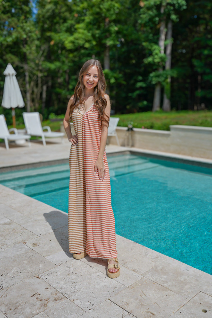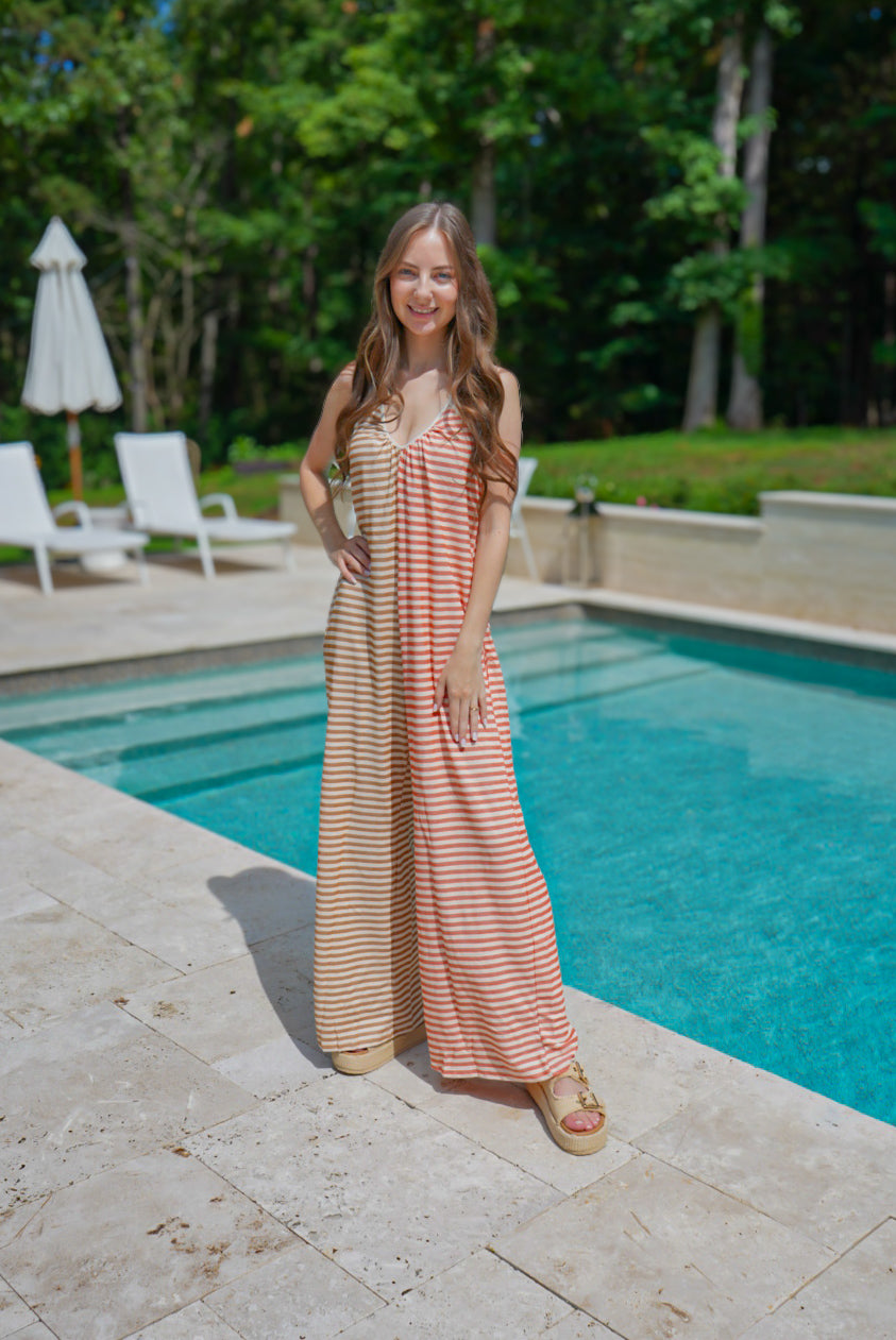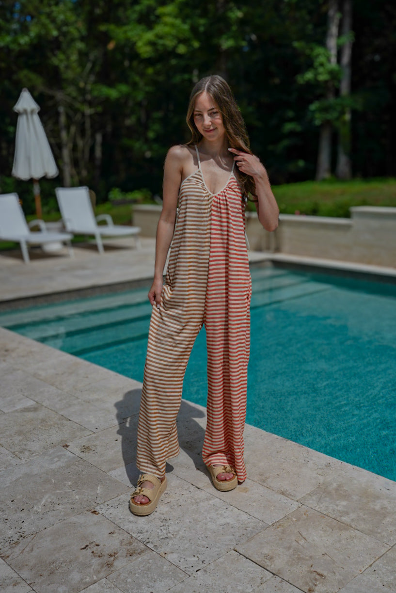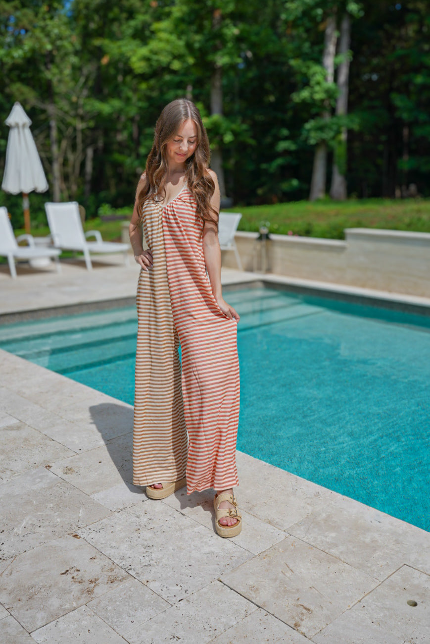 Take your style to the next level with our Take Me Somewhere Jumpsuit! This versatile and trendy jumpsuit features a camel/coral color combination, a flattering v-neck neckline, and a contrasting striped knit fabric. With its wide leg design, this jumpsuit will make you stand out in any crowd. Elevate your wardrobe today!