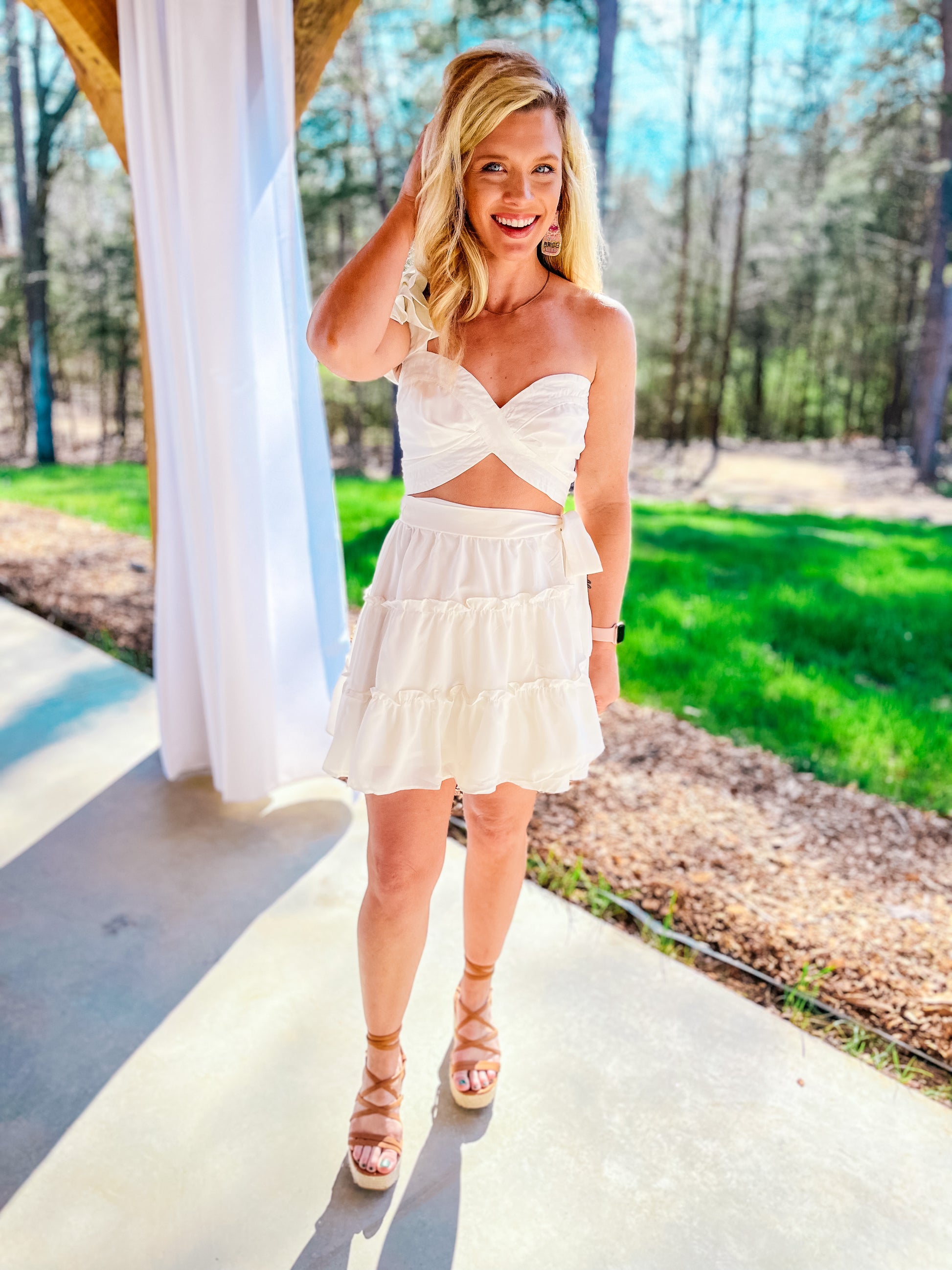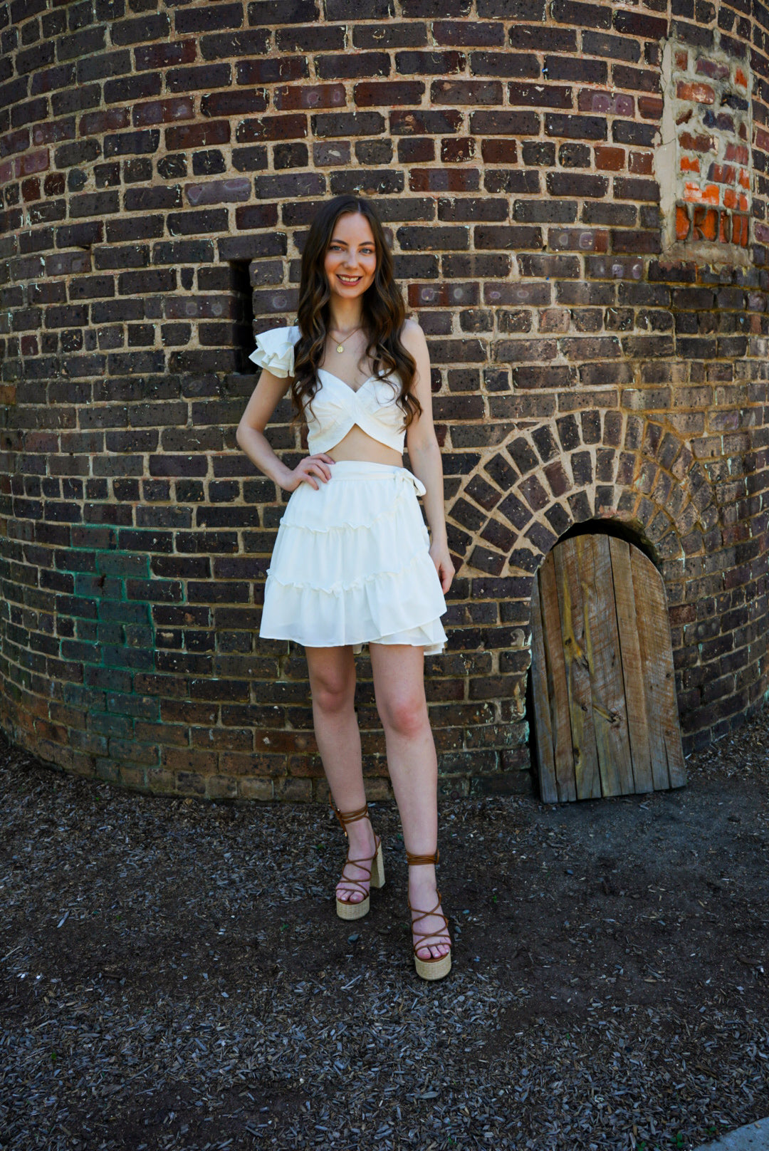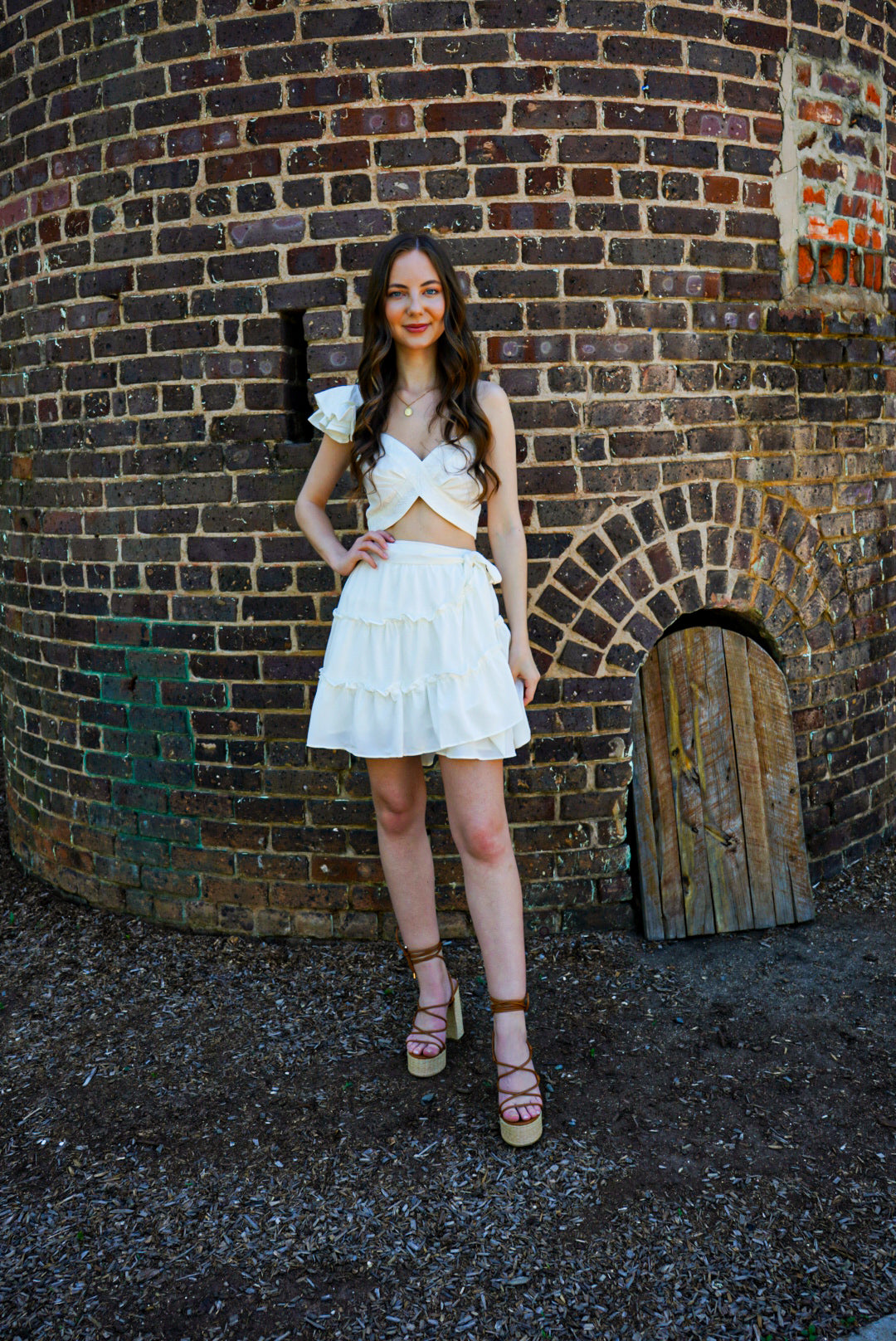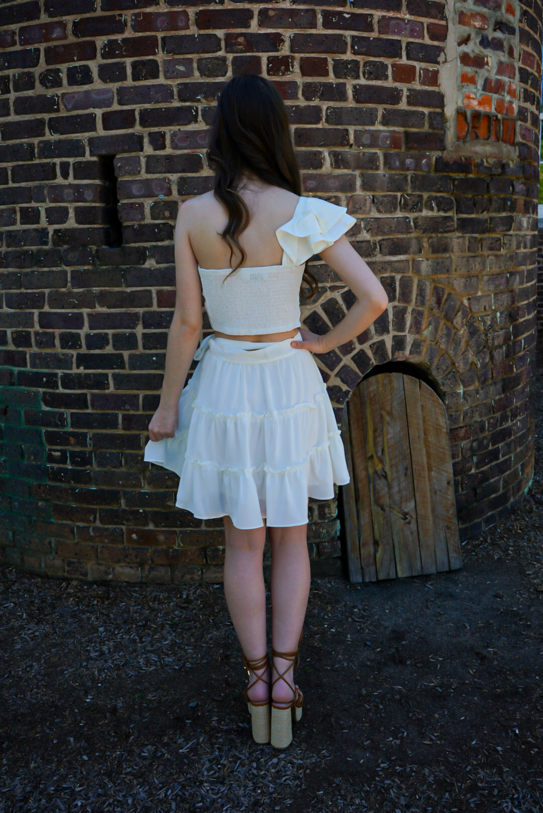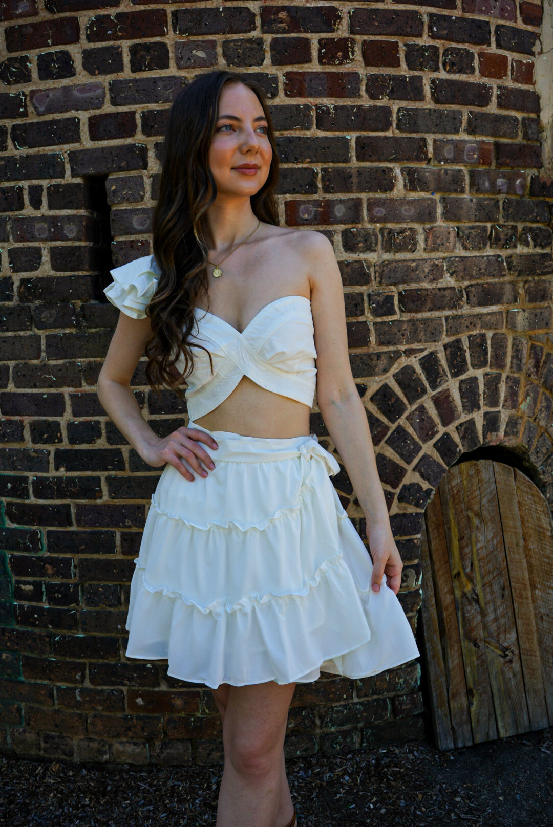 Take this Ticket To Love Set along for a flirty and fun night out. A white two-piece with an off-shoulder top and a ruffled wrap skirt - you'll be looking fabulous and giving off major vacay vibes! Bon voyage!