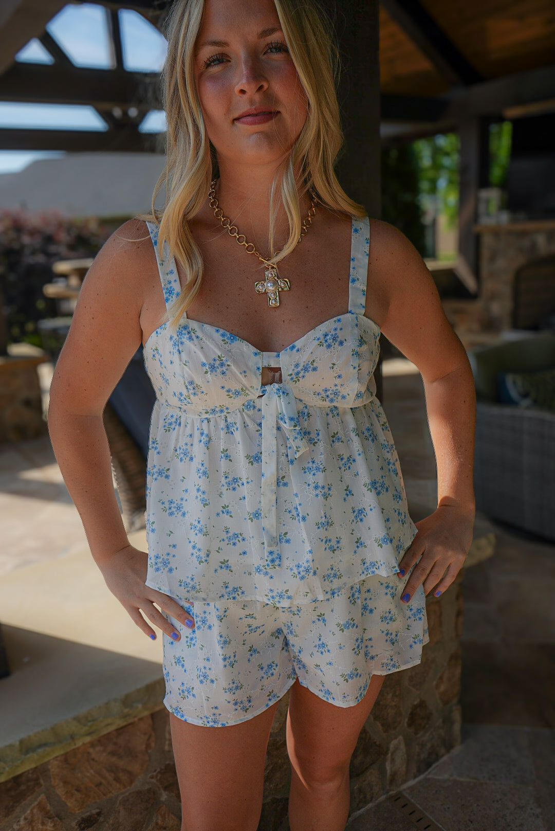 Drift into cottagecore charm with The Cottage Bloom Set — a dreamy duo that feels like a warm breeze on a wildflower-covered hill. The blue and white floral print sets a sweet, vintage-inspired tone, while the top features a romantic sweetheart neckline, center tie detail, wide shoulder straps, a layered peplum hem, and a hidden back zipper closure for a flattering fit. The matching shorts offer a relaxed silhouette with an easy elastic waistband for all-day comfort. Wear them together for a complete look or mix and match with your favorite basics — either way, you’ll be blooming in style.