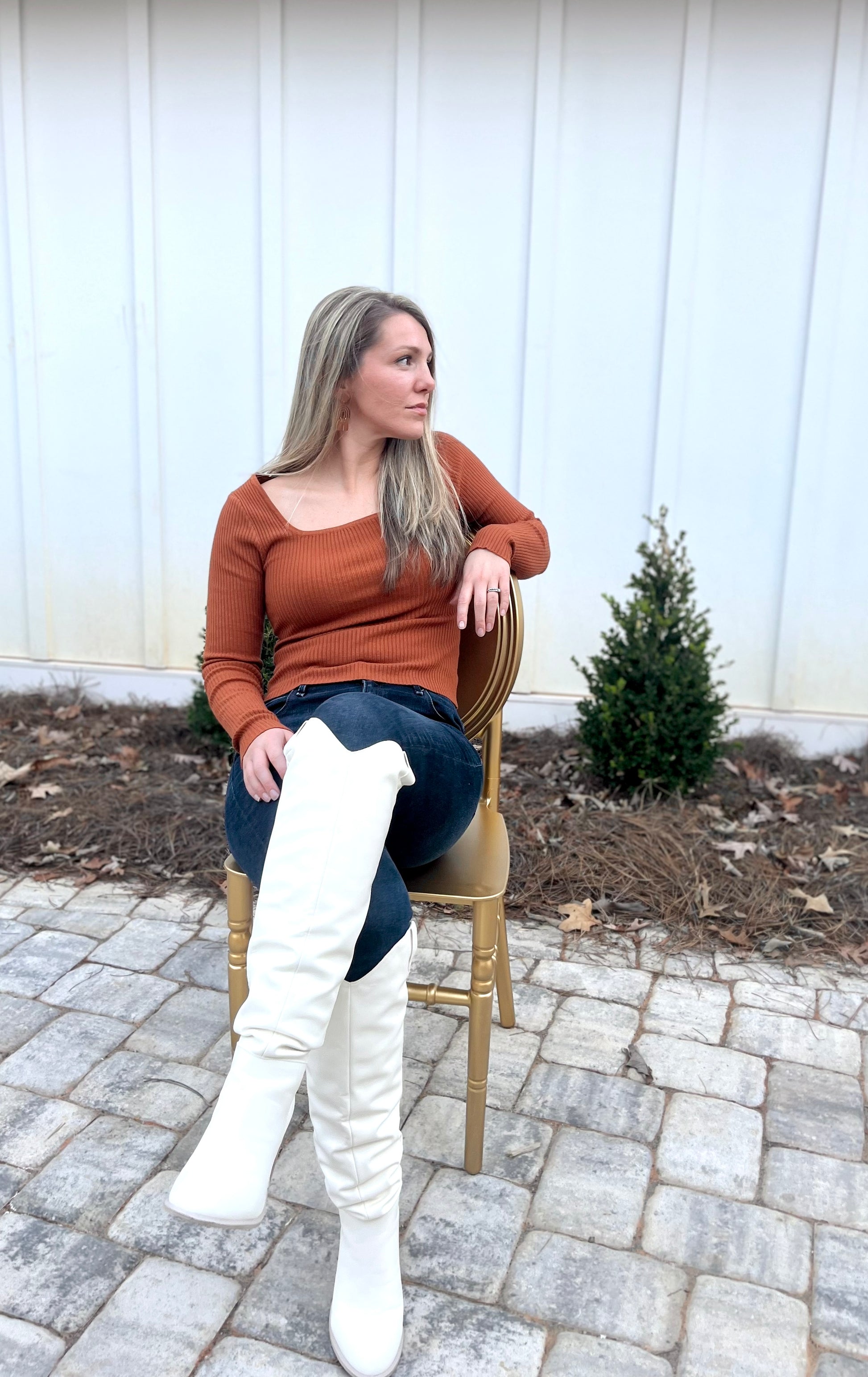 Fitted Long Sleeve Square Neck Fine Gauge Rib Pullover, 50% Visc, 28% Poly, 22% Nylon